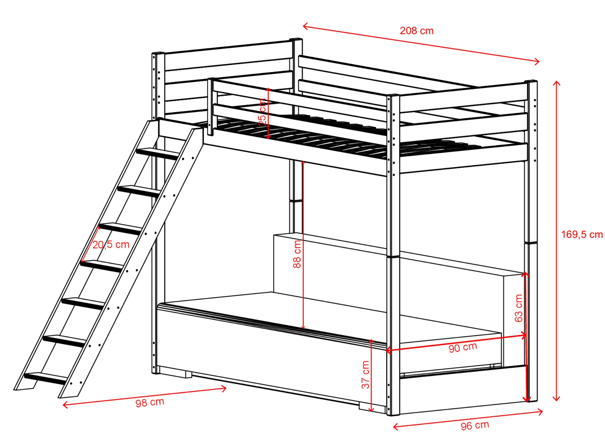 - Dvě plnohodnotná místa v jednom kusu nábytku Nahoře postel 90x200, dole rozkládací pohovka 140x200 – ideální pro dítě, teenagera nebo hosty.