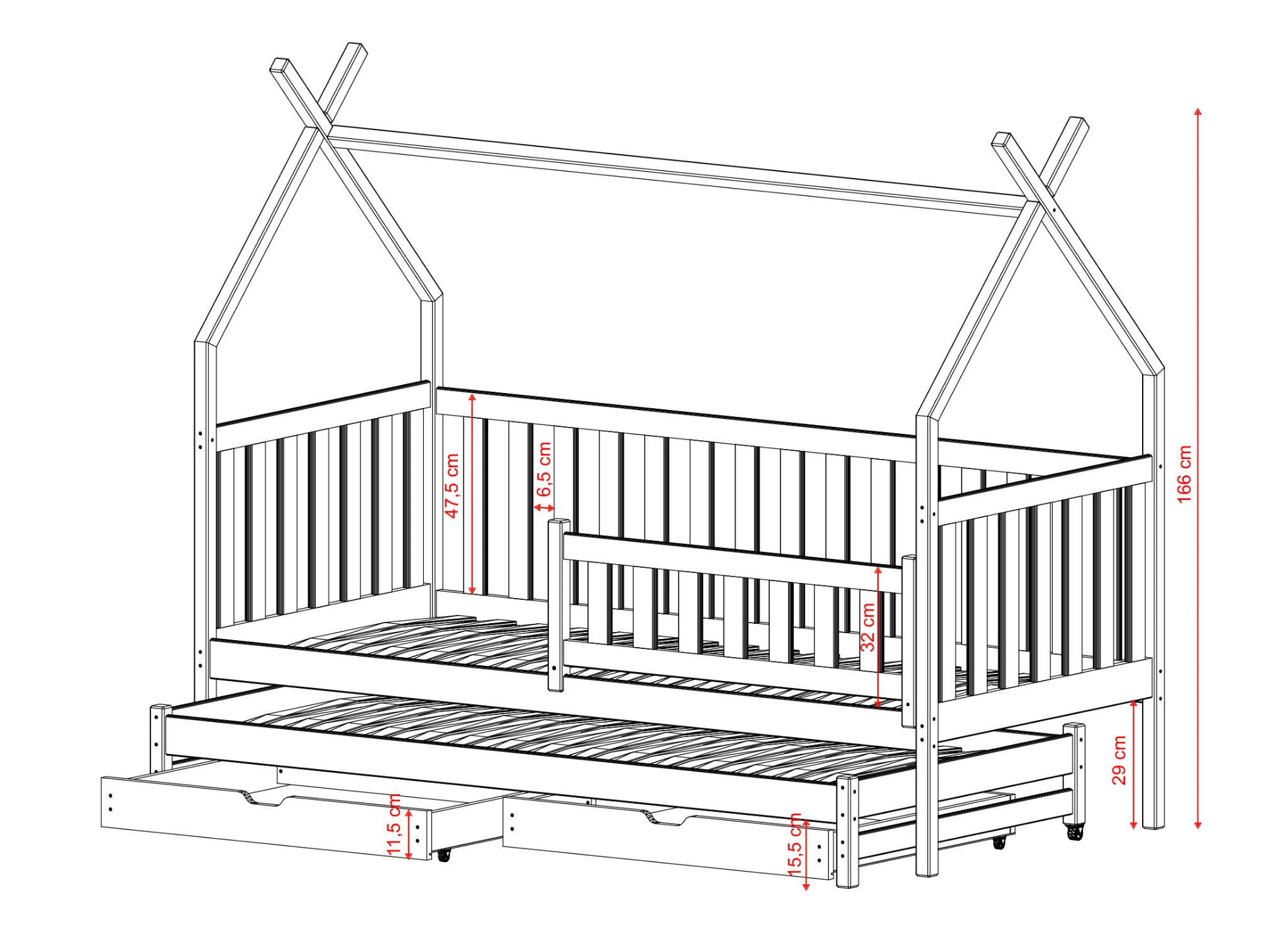 Nemůžete najít postel, která by se líbila vašim dětem? Ukažte jim TYTUSA – naši nízkou patrovou postel ve tvaru týpí, a uvidíte, že ji budou chtít mít ve svém pokoji hned. Tento model má nevšední vzhled připomínající stan, a navíc nabízí řadu praktických využití, které oceníte jako rodiče. Určitě se podívejte na všechny varianty patrové postele ve tvaru týpí se zásuvkami, které jsme pro vás připravili. Poznejte naši výjimečnou patrovou postel ve tvaru týpí TYTUS od Lano Meble a dopřejte svým dětem pokoj, ve kterém se budou cítit opravdu dobře.