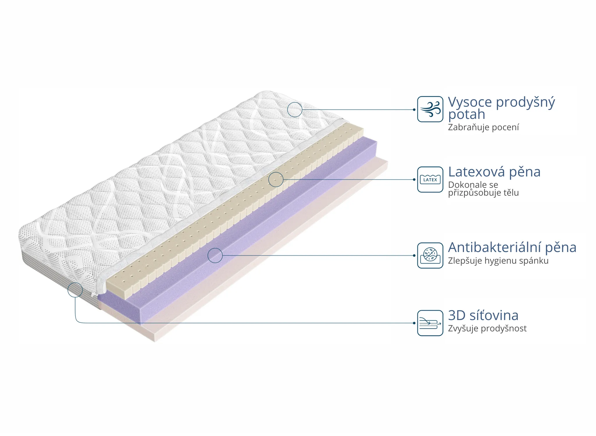 | Náplň | Potah z úpletu Open Dream + 3D síťka 1 cm; latexová pěna 3 cm; antibakteriální vysoce elastická pěna 6 cm; polyuretanová pěna 3 cm |
