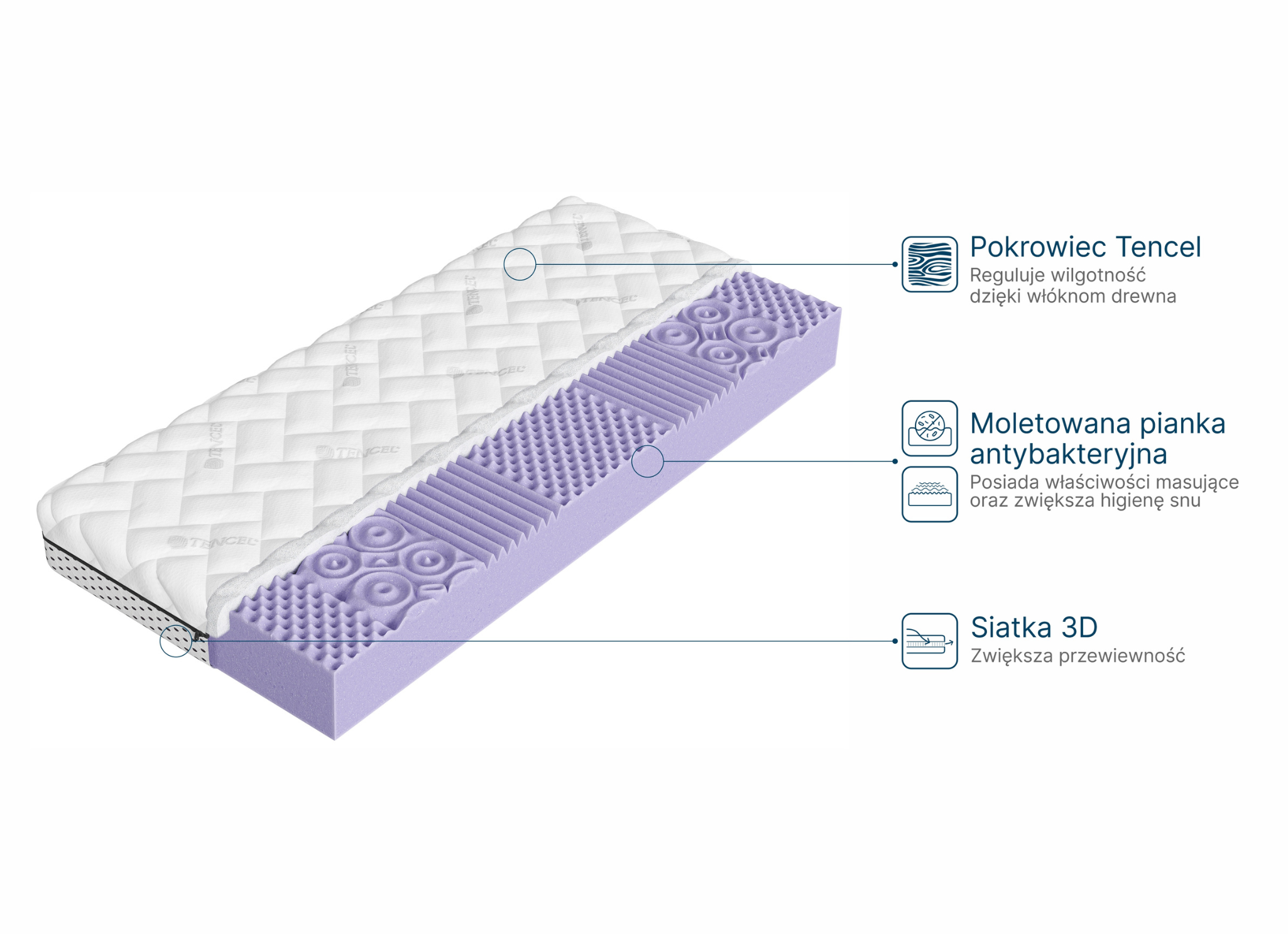 Matrace s moletovanou pěnou dokonale podporuje páteř ve všech částech a zároveň snižuje riziko vzniku necitlivosti těla. Je to matrace, která se přizpůsobuje tvaru těla. Vaše dítě pocítí potěšení z luxusního spánku. Matrace SPA je obohacena speciální antibakteriální vložkou, která umožňuje udržet vysokou hygienu. To je obzvláště důležité pro děti trpící alergiemi. Speciální konstrukce zajišťuje, že matrace je skvěle ventilována, což snižuje riziko hromadění vlhkosti a také pocení během spánku. Je to mimořádně pohodlná antibakteriální matrace ve stylu Lano.
