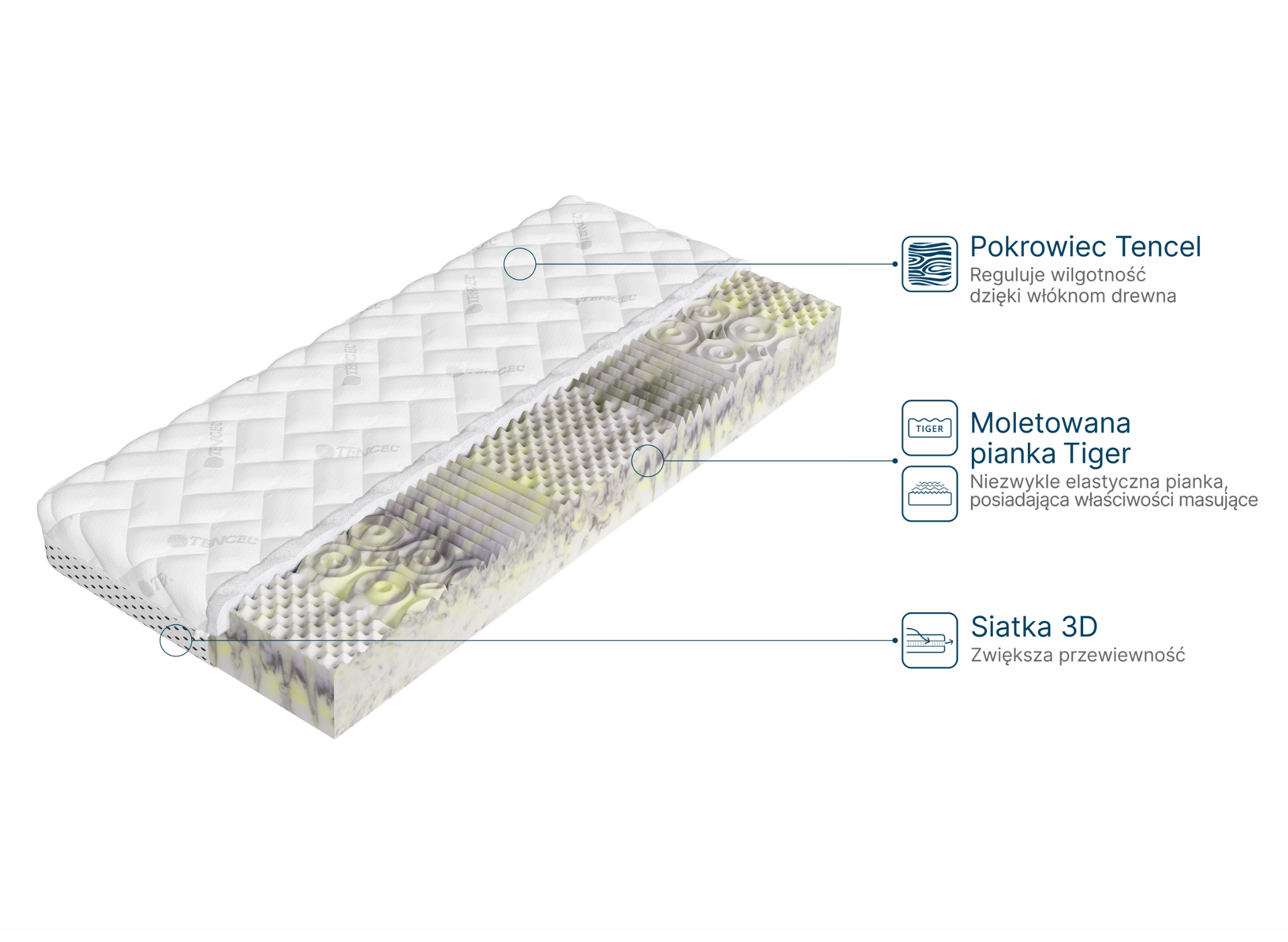 - Výjimečná struktura, kterou poznáte podle bloku vysoce elastické pěny – ta je zodpovědná za spolehlivou ventilaci matrace Lano Meble TIGER.