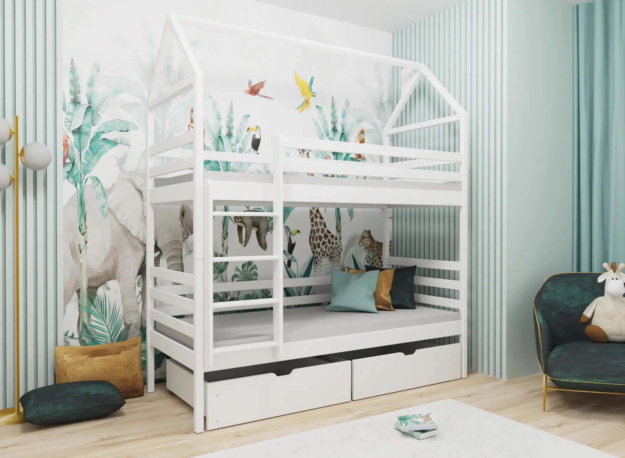 Dětská postel domeček ALEX je splněním snů každého malého dítěte. Je to pečlivě promyšlená a precizně zhotovená konstrukce, která podporuje kreativitu a stimuluje smysly. Velká odolnost a stabilita zajišťují, že je to nábytek pro děti, který bude bez problémů používán po mnoho let. Zaručujeme také, že každé dítě bude mít z jeho vlastnictví radost každý den. V Lano Meble klademe velký důraz nejen na vizuální stránku, ale především na funkčnost dětských postelí. Proto patrová postel domeček ALEX zajišťuje nejen pohodlný spánek, ale i bezpečné uložení různých drobností. Pod dětskou postelí ALEX se nacházejí praktické zásuvky, které umožňují uložení ložního prádla, oblečení a mnoha hraček. Už nebudete mít problém s rozházenými předměty po pokoji. Teď na ně bude vždy místo.
