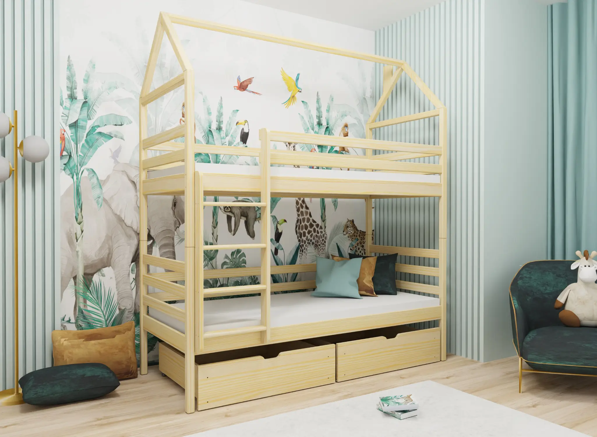 Dětská postel domeček ALEX je splněním snů každého malého dítěte. Je to pečlivě promyšlená a precizně zhotovená konstrukce, která podporuje kreativitu a stimuluje smysly. Velká odolnost a stabilita zajišťují, že je to nábytek pro děti, který bude bez problémů používán po mnoho let. Zaručujeme také, že každé dítě bude mít z jeho vlastnictví radost každý den. V Lano Meble klademe velký důraz nejen na vizuální stránku, ale především na funkčnost dětských postelí. Proto patrová postel domeček ALEX zajišťuje nejen pohodlný spánek, ale i bezpečné uložení různých drobností. Pod dětskou postelí ALEX se nacházejí praktické zásuvky, které umožňují uložení ložního prádla, oblečení a mnoha hraček. Už nebudete mít problém s rozházenými předměty po pokoji. Teď na ně bude vždy místo.