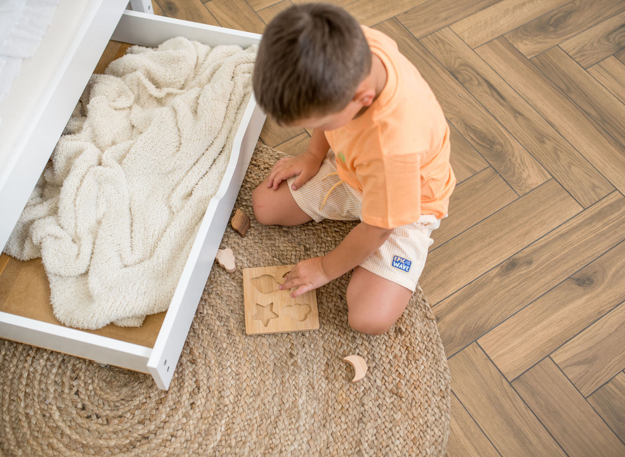 Přestože v dětském pokoji je skříň nebo samostatná šatna, určitě nepohrdneš dalším úložným prostorem – zvláště v místnosti s malým prostorem. V této dvojlůžkové dětské posteli jsou použity dvě výsuvné zásuvky. Co do nich schováš? Věci, které chceš mít po ruce – například další polštáře nebo teplou deku, kterou můžeš přikrýt dítě během chladné noci. Design postele AMELKA však okouzlí nejen výsuvnou spodní platformou, na které může spát druhé dítě. Konstrukce je také navržena s ohledem na maximální bezpečnost dítěte. Hlavní postel je obklopena vysokou zábranou, díky které se tvoje ratolest určitě neskutálí na osobu spící níže. Oba spací úrovně jsou navíc umístěny tak nízko, že případný pád na zem nebude bolestivý – pokud se rozhodneš odstranit boční lišty u staršího dítěte.