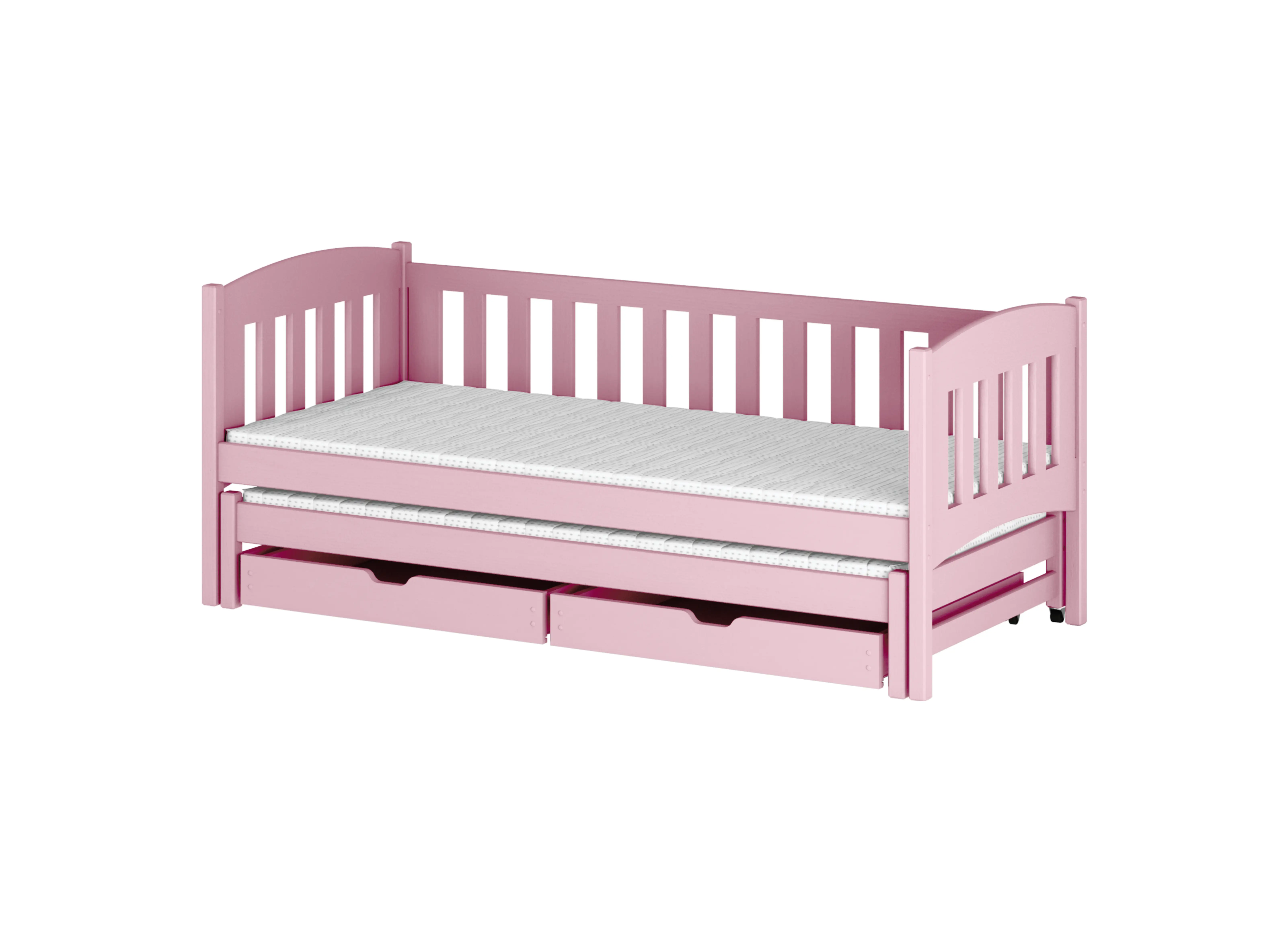 Přestože v dětském pokoji je skříň nebo samostatná šatna, určitě nepohrdneš dalším úložným prostorem – zvláště v místnosti s malým prostorem. V této dvojlůžkové dětské posteli jsou použity dvě výsuvné zásuvky. Co do nich schováš? Věci, které chceš mít po ruce – například další polštáře nebo teplou deku, kterou můžeš přikrýt dítě během chladné noci. Design postele AMELKA však okouzlí nejen výsuvnou spodní platformou, na které může spát druhé dítě. Konstrukce je také navržena s ohledem na maximální bezpečnost dítěte. Hlavní postel je obklopena vysokou zábranou, díky které se tvoje ratolest určitě neskutálí na osobu spící níže. Oba spací úrovně jsou navíc umístěny tak nízko, že případný pád na zem nebude bolestivý – pokud se rozhodneš odstranit boční lišty u staršího dítěte.