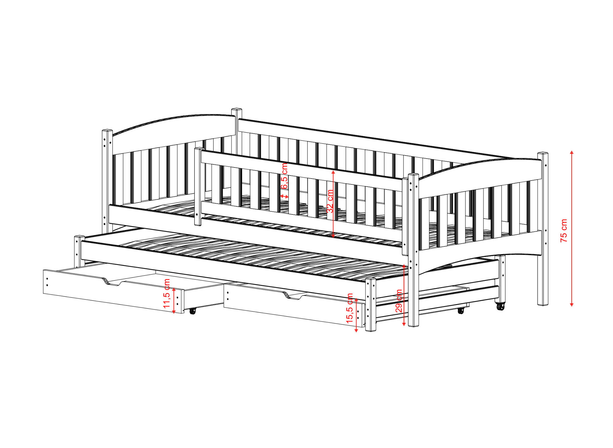 Přestože v dětském pokoji je skříň nebo samostatná šatna, určitě nepohrdneš dalším úložným prostorem – zvláště v místnosti s malým prostorem. V této dvojlůžkové dětské posteli jsou použity dvě výsuvné zásuvky. Co do nich schováš? Věci, které chceš mít po ruce – například další polštáře nebo teplou deku, kterou můžeš přikrýt dítě během chladné noci. Design postele AMELKA však okouzlí nejen výsuvnou spodní platformou, na které může spát druhé dítě. Konstrukce je také navržena s ohledem na maximální bezpečnost dítěte. Hlavní postel je obklopena vysokou zábranou, díky které se tvoje ratolest určitě neskutálí na osobu spící níže. Oba spací úrovně jsou navíc umístěny tak nízko, že případný pád na zem nebude bolestivý – pokud se rozhodneš odstranit boční lišty u staršího dítěte.