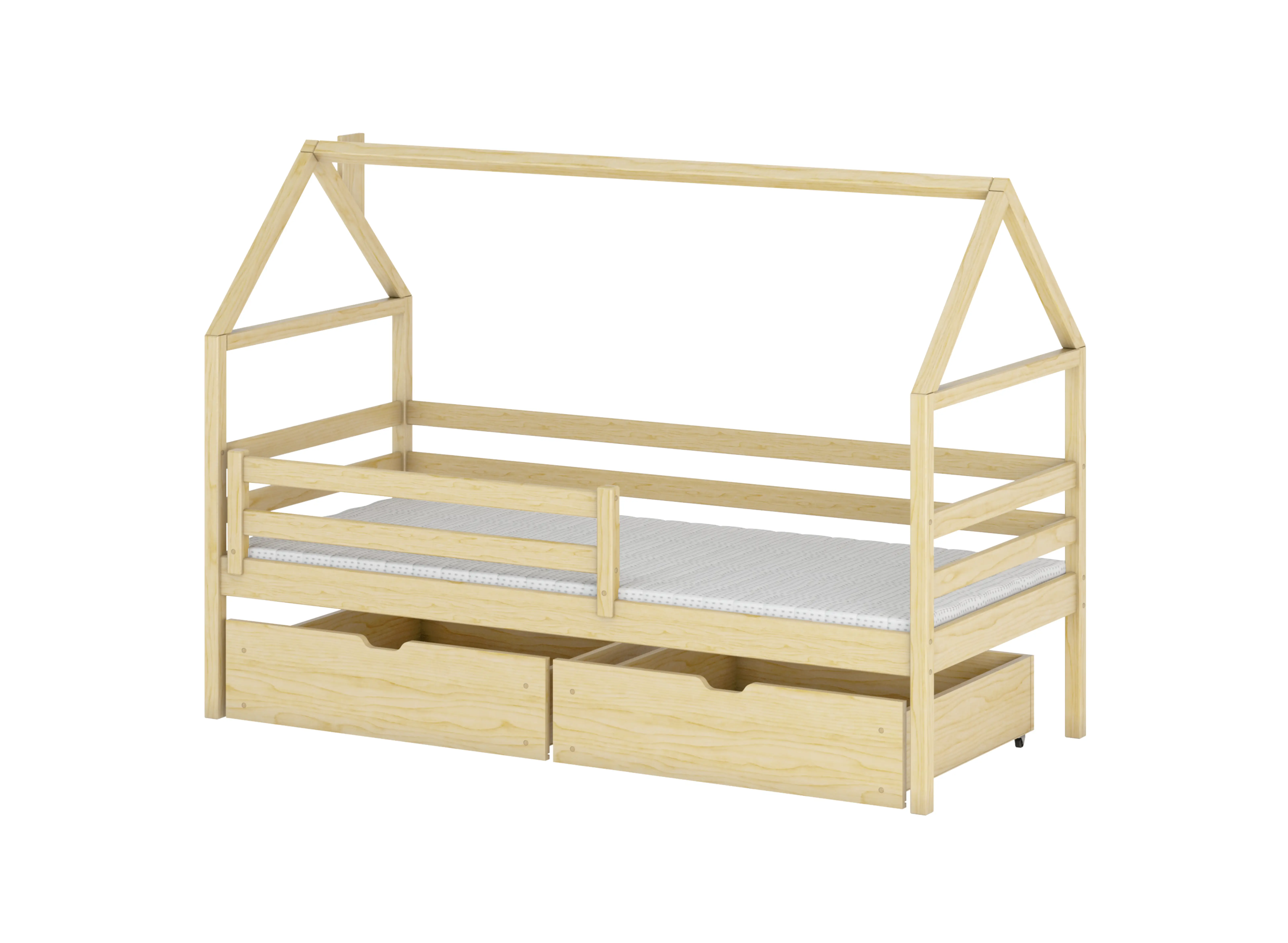 Postel s vestavěnou střechou není jen dekorativní prvek. Může být také použita jako část ochrany. Celá je vyrobena z pevných borovicových desek, které tvoří stabilní rám pro matraci. Rám postele je obklopen dřevěnými zábranami, což zajišťuje bezpečnost i pro nejživější děti. Konstrukce je navržena tak, aby se nepohybovala ani při největších dětských skotačeních. Celek je velmi snadný na montáž. Dá se říct, že je to dětsky jednoduché! Kromě pohodlné a pevné postele je důležité pamatovat na výběr správné matrace na spaní. Ta zajistí klidný odpočinek a komfort během spánku. Nevíte, jak vybrat matraci pro vaše děťátko? Není to nic složitého. Podívejte se do sekce JAK VYBRAT MATRACI nebo nás kontaktujte.