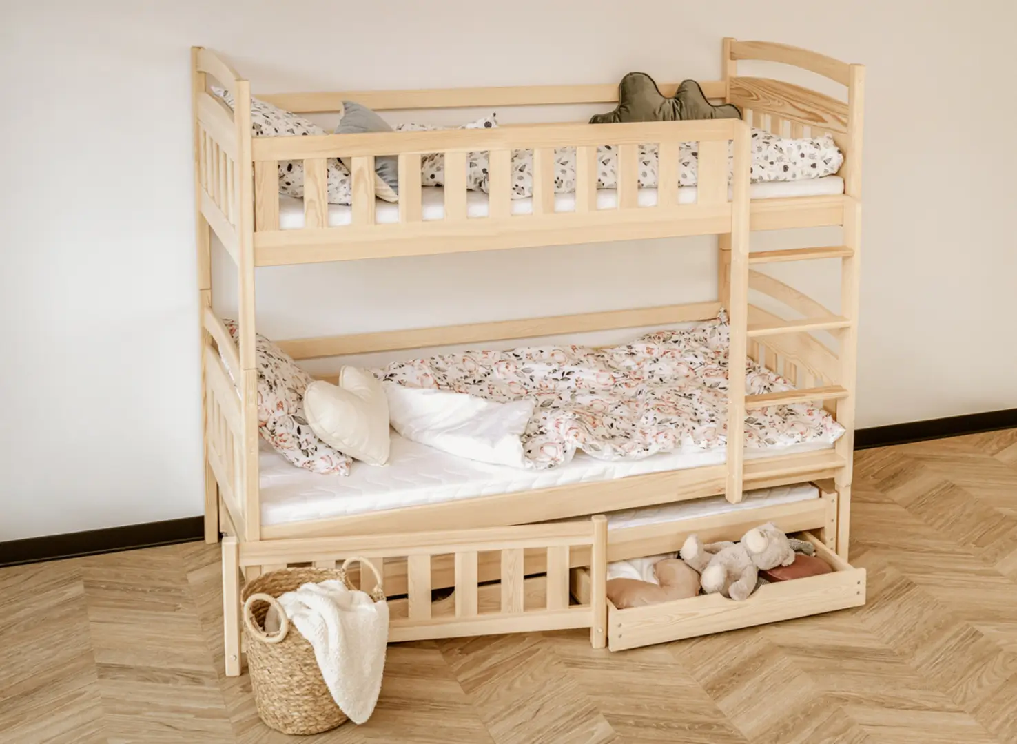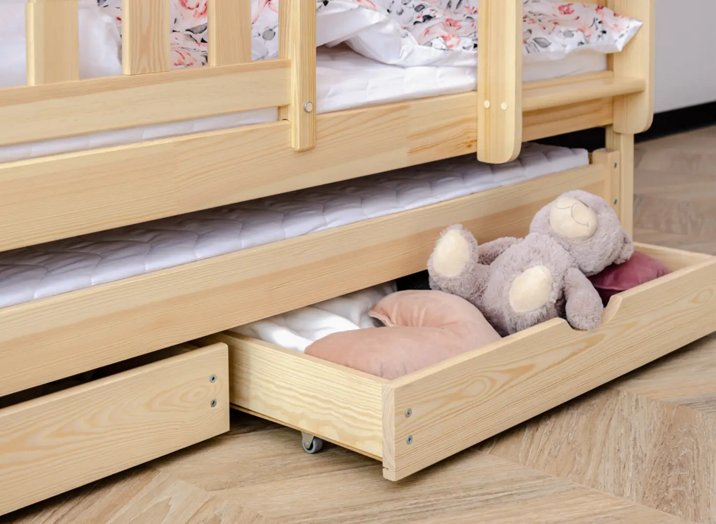 Na dně třílůžkové patrové postele BLANKA mohou být výsuvné zásuvky, pokud se rozhodnete pro tuto variantu. Jejich prostorný interiér pojme mnoho věcí, které zbytečně zabírají místo v dětském pokoji, například dávno nepoužívané hračky nebo deky, které používáte jen v zimě. Další, výsuvná matrace dole se stane neocenitelnou pomocí, když vaše dítě pozve kamarády na nocování – zajistí pohodlí hostům, aniž byste museli sahat po nafukovacích matracích.