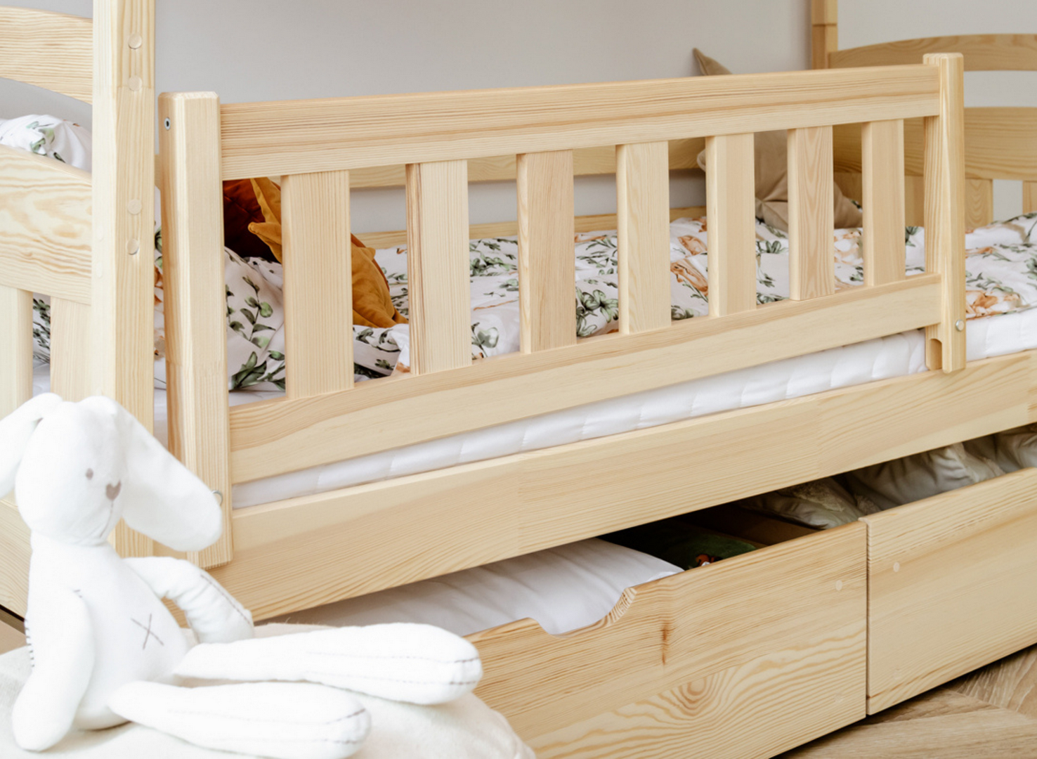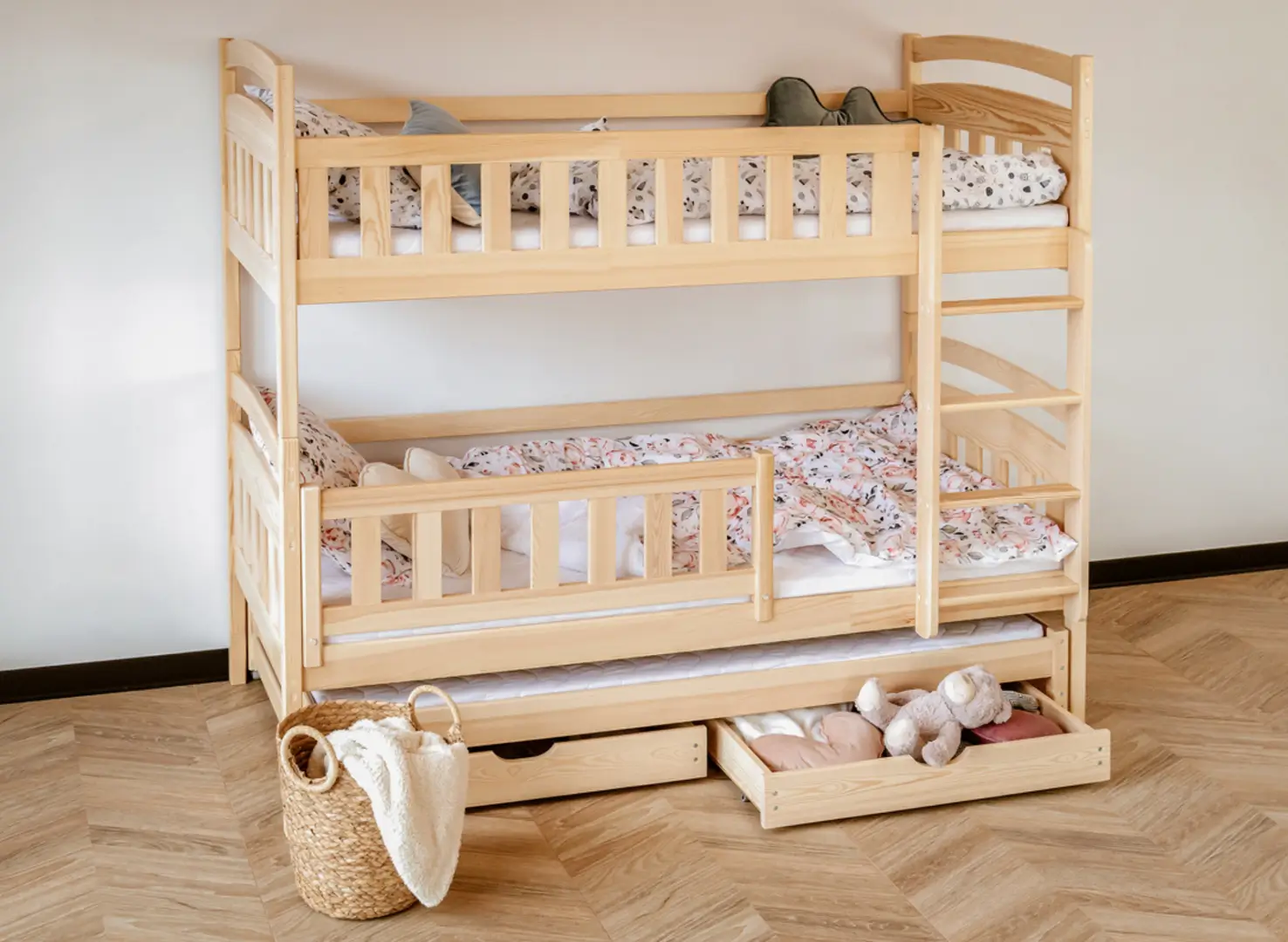 Na dně třílůžkové patrové postele BLANKA mohou být výsuvné zásuvky, pokud se rozhodnete pro tuto variantu. Jejich prostorný interiér pojme mnoho věcí, které zbytečně zabírají místo v dětském pokoji, například dávno nepoužívané hračky nebo deky, které používáte jen v zimě. Další, výsuvná matrace dole se stane neocenitelnou pomocí, když vaše dítě pozve kamarády na nocování – zajistí pohodlí hostům, aniž byste museli sahat po nafukovacích matracích.
