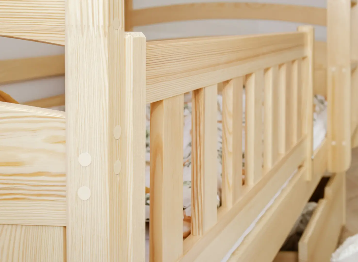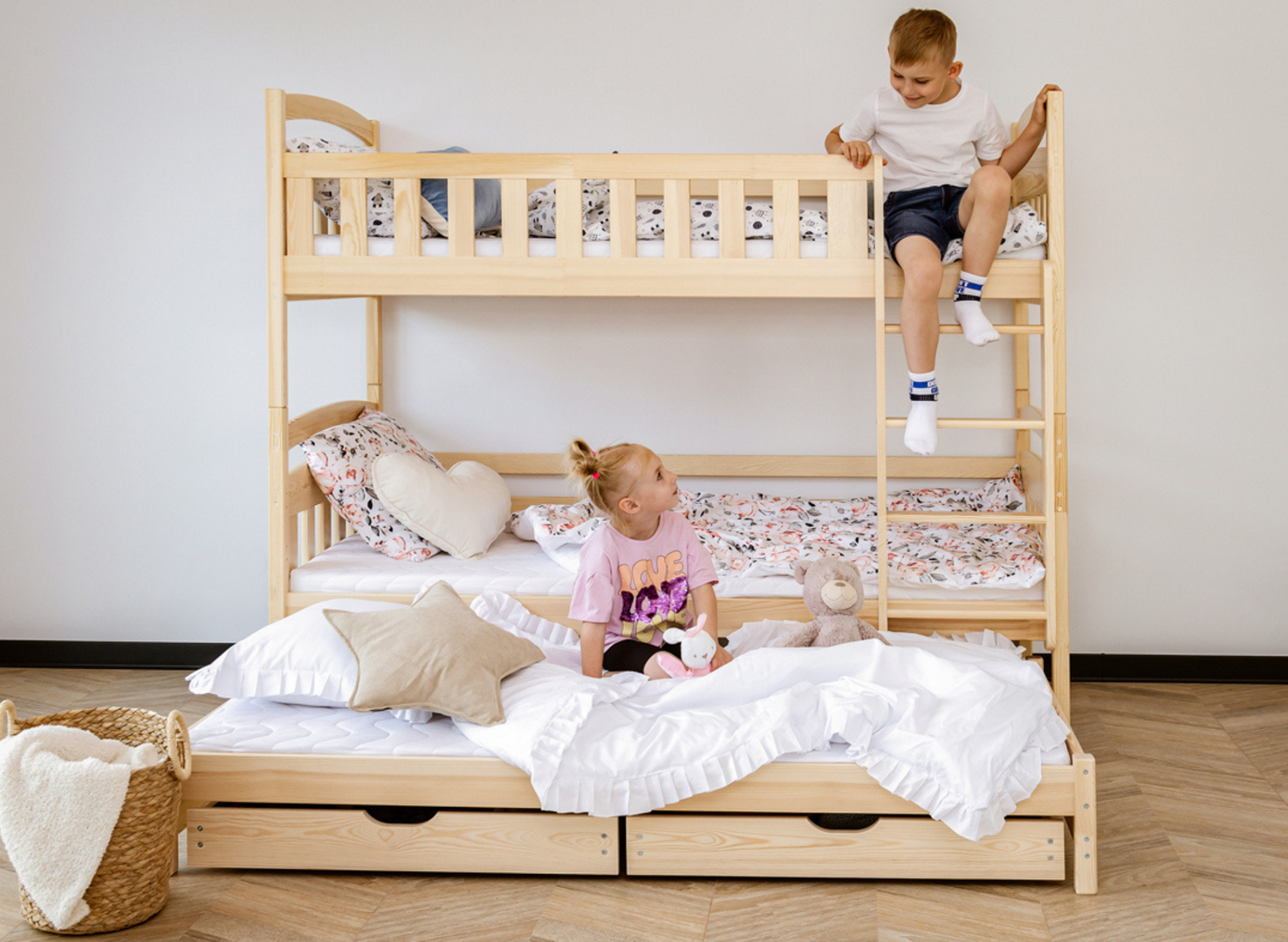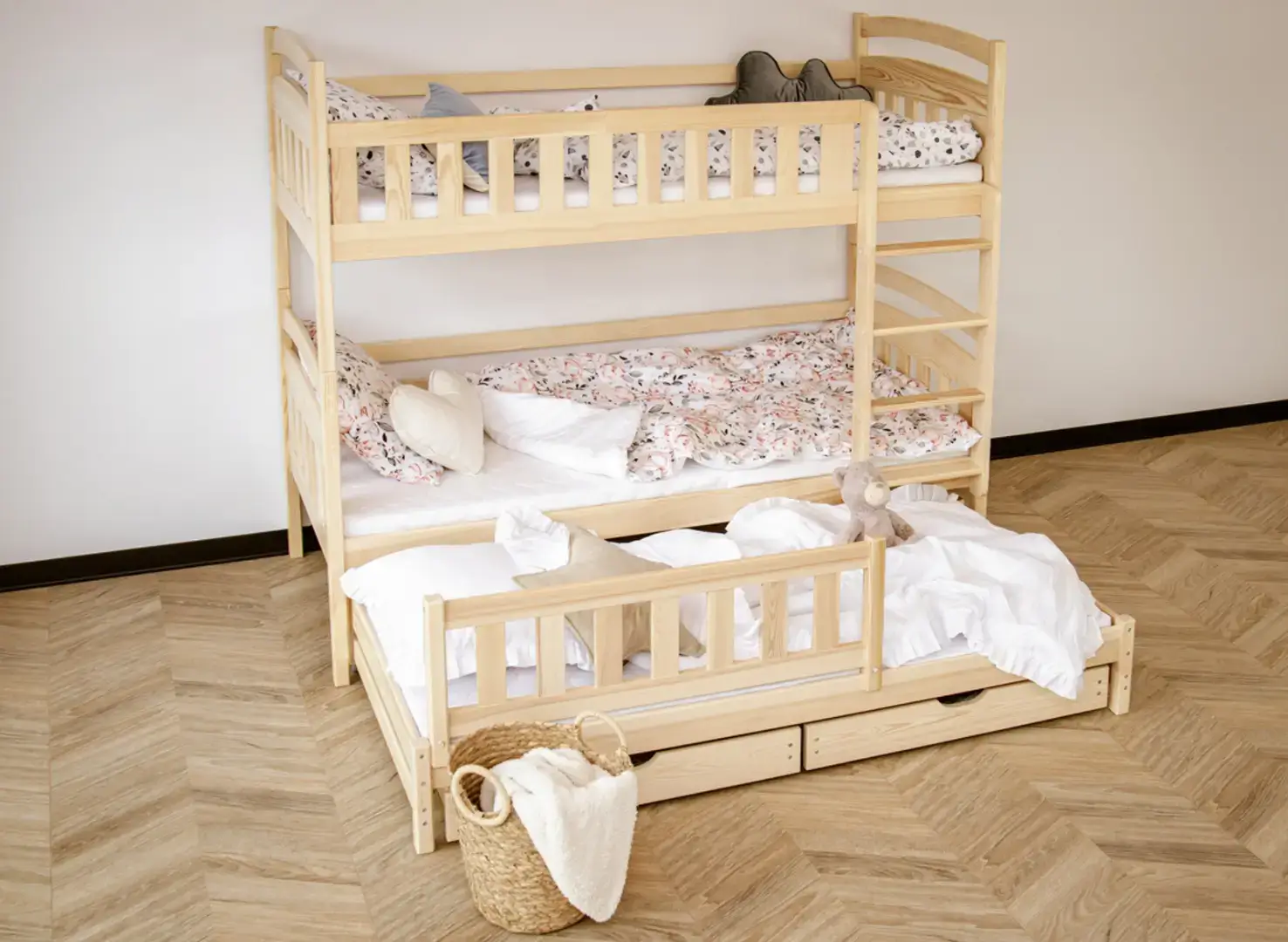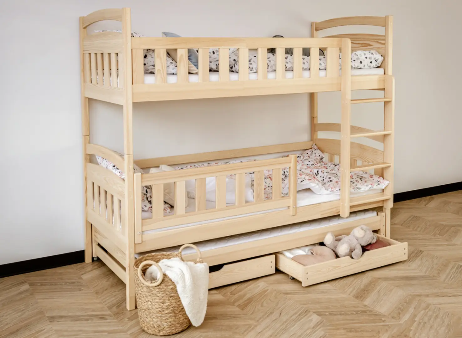 Na dně třílůžkové patrové postele BLANKA mohou být výsuvné zásuvky, pokud se rozhodnete pro tuto variantu. Jejich prostorný interiér pojme mnoho věcí, které zbytečně zabírají místo v dětském pokoji, například dávno nepoužívané hračky nebo deky, které používáte jen v zimě. Další, výsuvná matrace dole se stane neocenitelnou pomocí, když vaše dítě pozve kamarády na nocování – zajistí pohodlí hostům, aniž byste museli sahat po nafukovacích matracích.