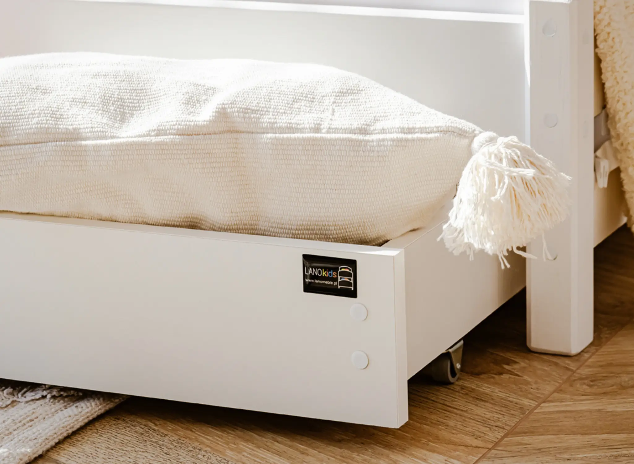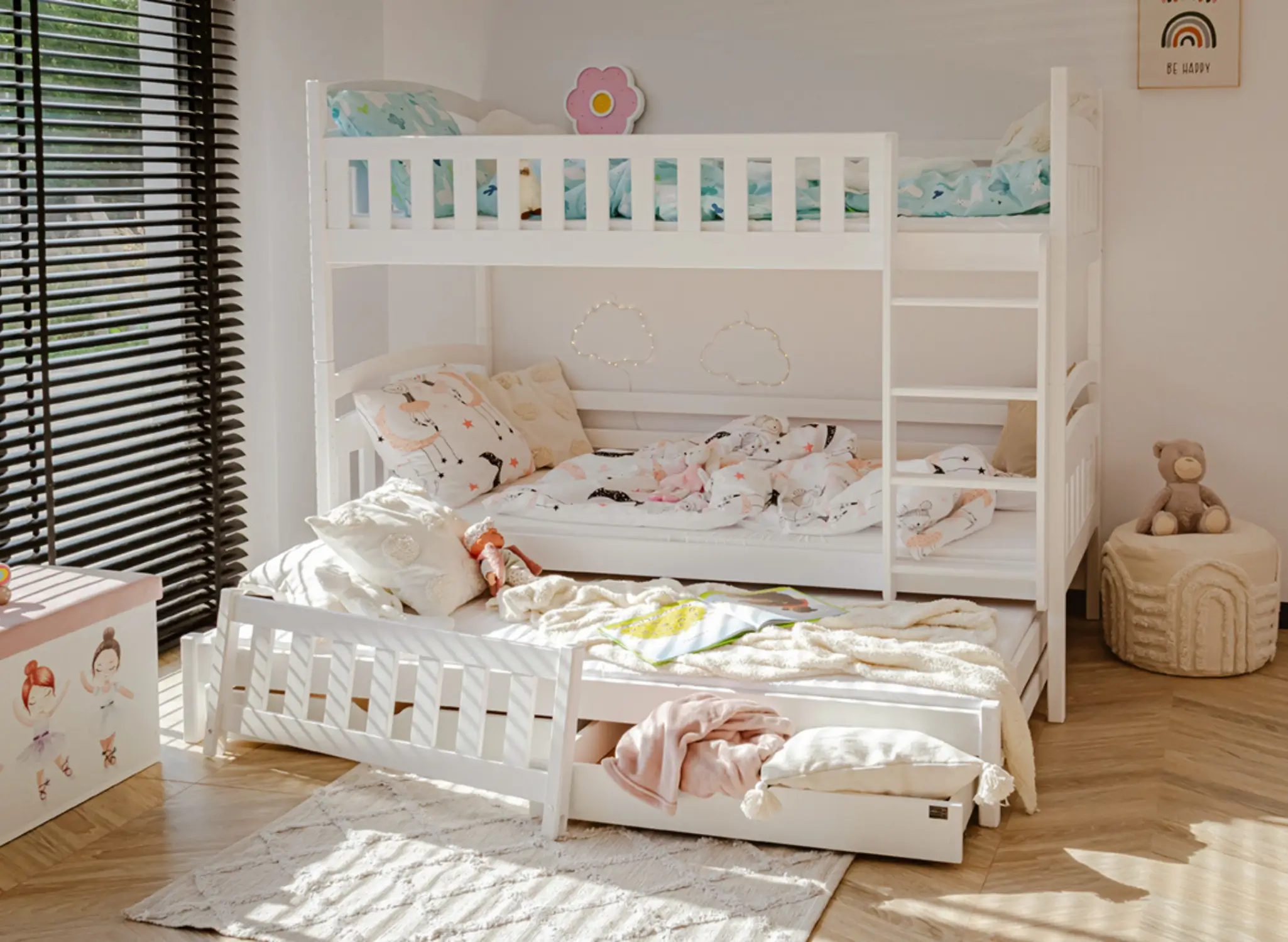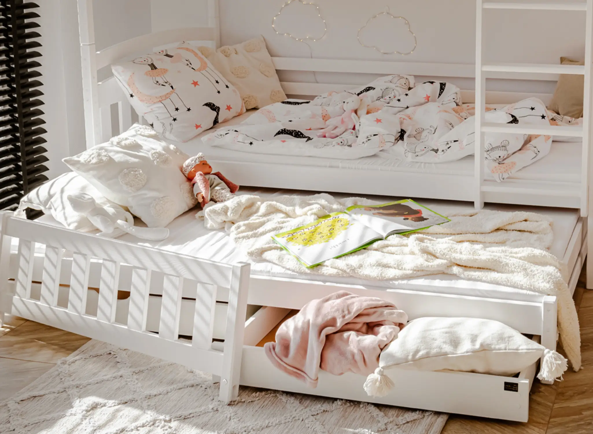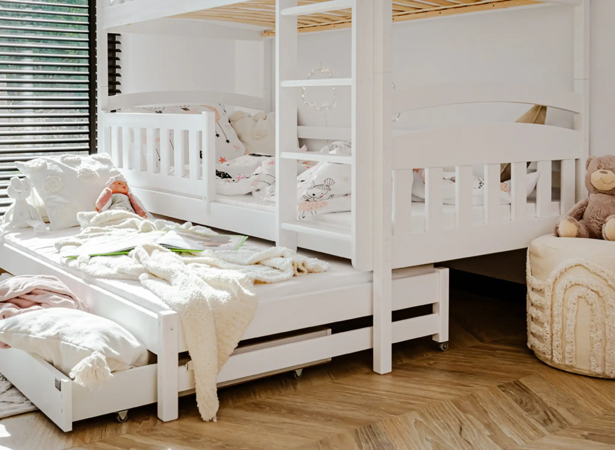 Na dně třílůžkové patrové postele BLANKA mohou být výsuvné zásuvky, pokud se rozhodnete pro tuto variantu. Jejich prostorný interiér pojme mnoho věcí, které zbytečně zabírají místo v dětském pokoji, například dávno nepoužívané hračky nebo deky, které používáte jen v zimě. Další, výsuvná matrace dole se stane neocenitelnou pomocí, když vaše dítě pozve kamarády na nocování – zajistí pohodlí hostům, aniž byste museli sahat po nafukovacích matracích.