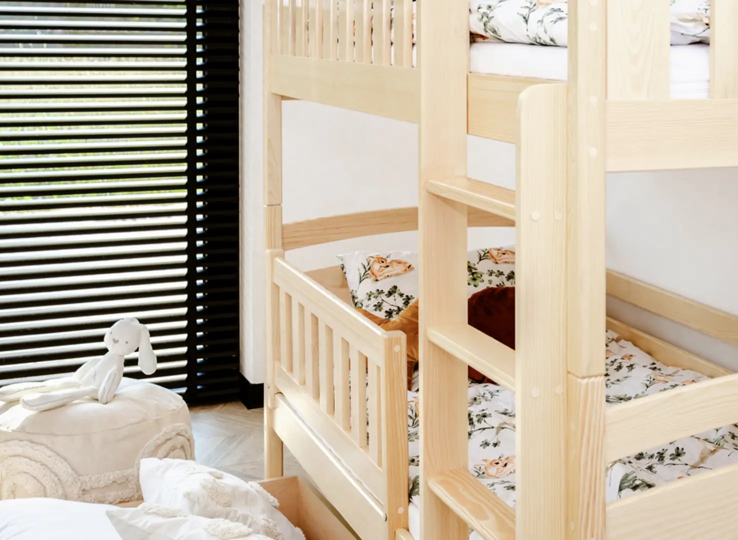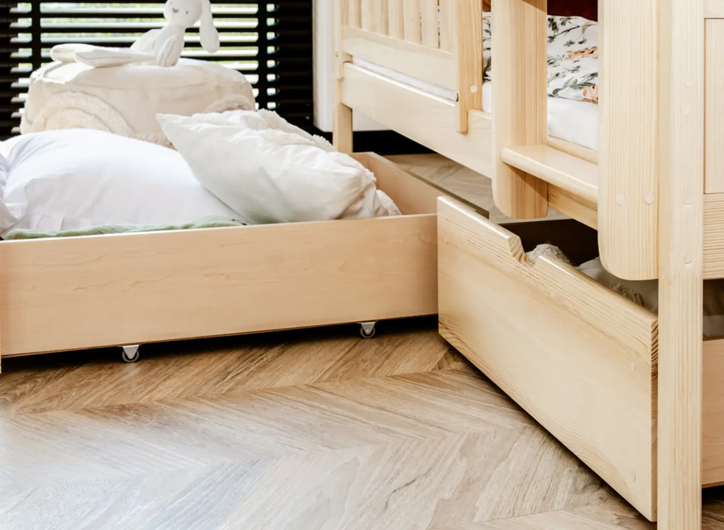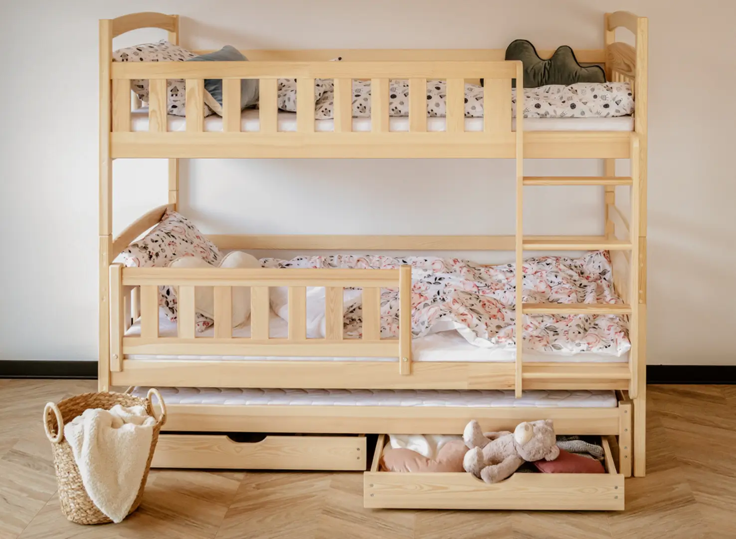 Na dně třílůžkové patrové postele BLANKA mohou být výsuvné zásuvky, pokud se rozhodnete pro tuto variantu. Jejich prostorný interiér pojme mnoho věcí, které zbytečně zabírají místo v dětském pokoji, například dávno nepoužívané hračky nebo deky, které používáte jen v zimě. Další, výsuvná matrace dole se stane neocenitelnou pomocí, když vaše dítě pozve kamarády na nocování – zajistí pohodlí hostům, aniž byste museli sahat po nafukovacích matracích.