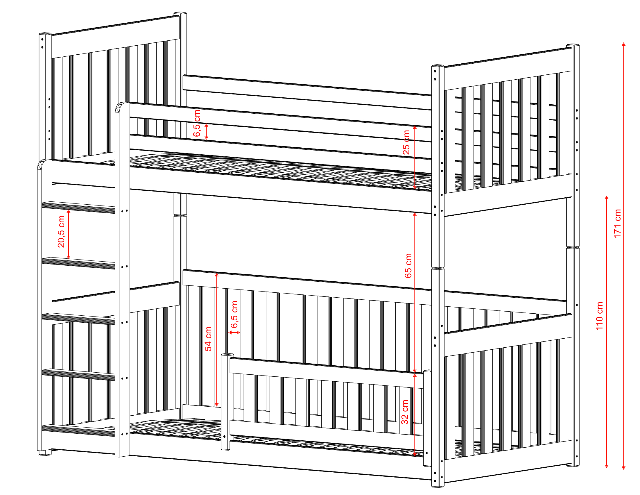 Patrová postel CRIS je ideální volbou pro dvě děti. Vyrobili jsme nábytek z pevného borovicového dřeva, což zaručuje jeho odolnost. Dětská postel CRIS kombinuje funkčnost a krásný design. Použili jsme zde dřevěné zábradlí a je zde také žebřík – dětský pokoj ožije s tímto nábytkem. Patrová postel CRIS má mnoho možností konfigurace. Můžete si především vybrat jednu z mnoha matrací na spodní a horní část. Lze také upravit výšku a zábradlí. Tento model má opravdu mnoho výhod. Především je patrová postel CRIS pevně vyrobená – vydrží mnoho let. Kromě toho jsme ji vybavili praktickými zábradlími a univerzálním žebříkem. Váš dětský pokoj získá jedinečnou atmosféru díky designu této patrové postele. Náš CRIS je synonymem pohodlí a funkčnosti. Postarali jsme se o pevnou konstrukci nábytku a mnoho dalších prvků, abychom dodali jedinečnou a velmi pohodlnou dětskou postel pro vaše děti.