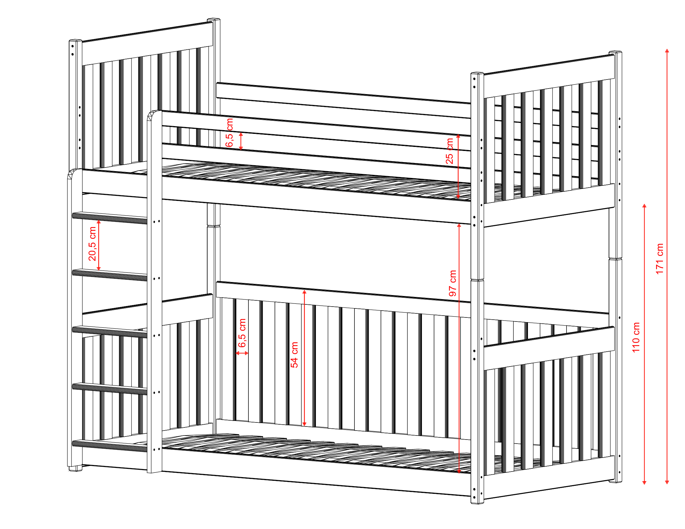 Patrová postel CRIS je ideální volbou pro dvě děti. Vyrobili jsme nábytek z pevného borovicového dřeva, což zaručuje jeho odolnost. Dětská postel CRIS kombinuje funkčnost a krásný design. Použili jsme zde dřevěné zábradlí a je zde také žebřík – dětský pokoj ožije s tímto nábytkem. Patrová postel CRIS má mnoho možností konfigurace. Můžete si především vybrat jednu z mnoha matrací na spodní a horní část. Lze také upravit výšku a zábradlí. Tento model má opravdu mnoho výhod. Především je patrová postel CRIS pevně vyrobená – vydrží mnoho let. Kromě toho jsme ji vybavili praktickými zábradlími a univerzálním žebříkem. Váš dětský pokoj získá jedinečnou atmosféru díky designu této patrové postele. Náš CRIS je synonymem pohodlí a funkčnosti. Postarali jsme se o pevnou konstrukci nábytku a mnoho dalších prvků, abychom dodali jedinečnou a velmi pohodlnou dětskou postel pro vaše děti.