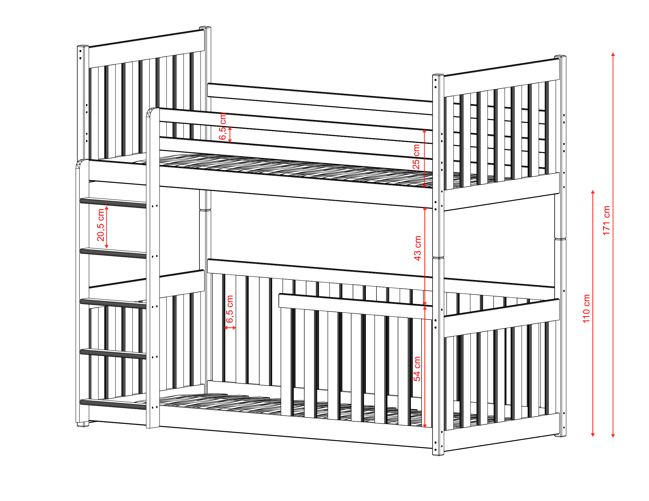 Patrová postel CRIS je ideální volbou pro dvě děti. Vyrobili jsme nábytek z pevného borovicového dřeva, což zaručuje jeho odolnost. Dětská postel CRIS kombinuje funkčnost a krásný design. Použili jsme zde dřevěné zábradlí a je zde také žebřík – dětský pokoj ožije s tímto nábytkem. Patrová postel CRIS má mnoho možností konfigurace. Můžete si především vybrat jednu z mnoha matrací na spodní a horní část. Lze také upravit výšku a zábradlí. Tento model má opravdu mnoho výhod. Především je patrová postel CRIS pevně vyrobená – vydrží mnoho let. Kromě toho jsme ji vybavili praktickými zábradlími a univerzálním žebříkem. Váš dětský pokoj získá jedinečnou atmosféru díky designu této patrové postele. Náš CRIS je synonymem pohodlí a funkčnosti. Postarali jsme se o pevnou konstrukci nábytku a mnoho dalších prvků, abychom dodali jedinečnou a velmi pohodlnou dětskou postel pro vaše děti.