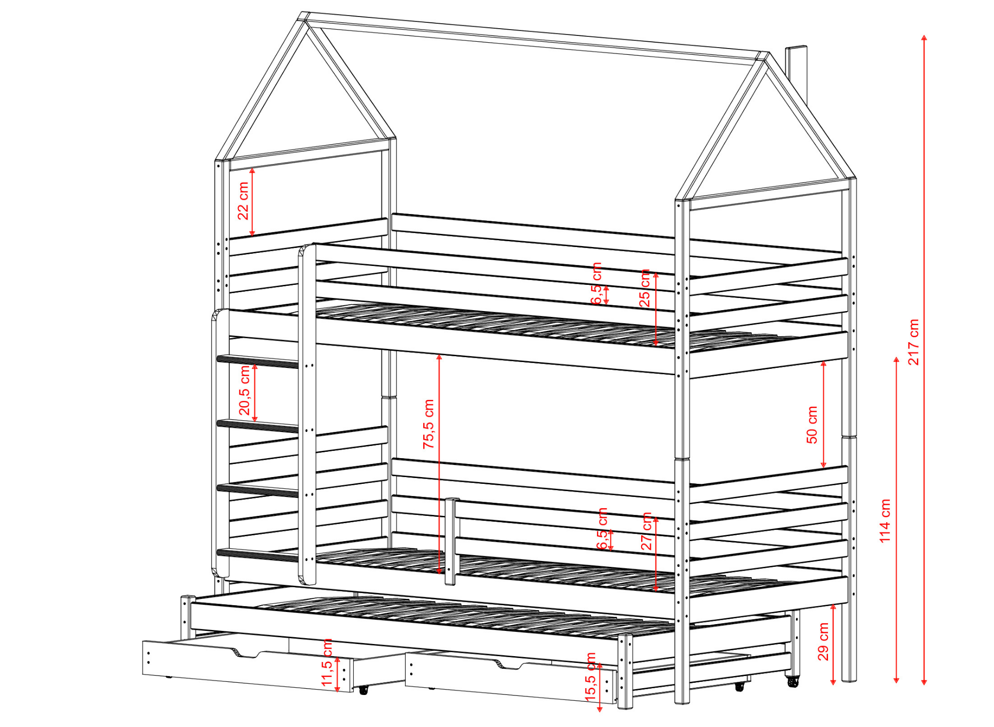 Patrové postele domek DALIA nejsou jen dobrým nápadem pro uspořádání malého dětského pokoje, ale také místem pro kreativní zábavu. A pokud jde o zábavu – pokud ti chybí místo na hry, hračky nebo jiné dětské předměty, patrová postel typu domek DALIA má pro tebe řešení. Nábytek má dvě prostorné zásuvky na ukládání, které pomohou udržet pořádek v místnosti.