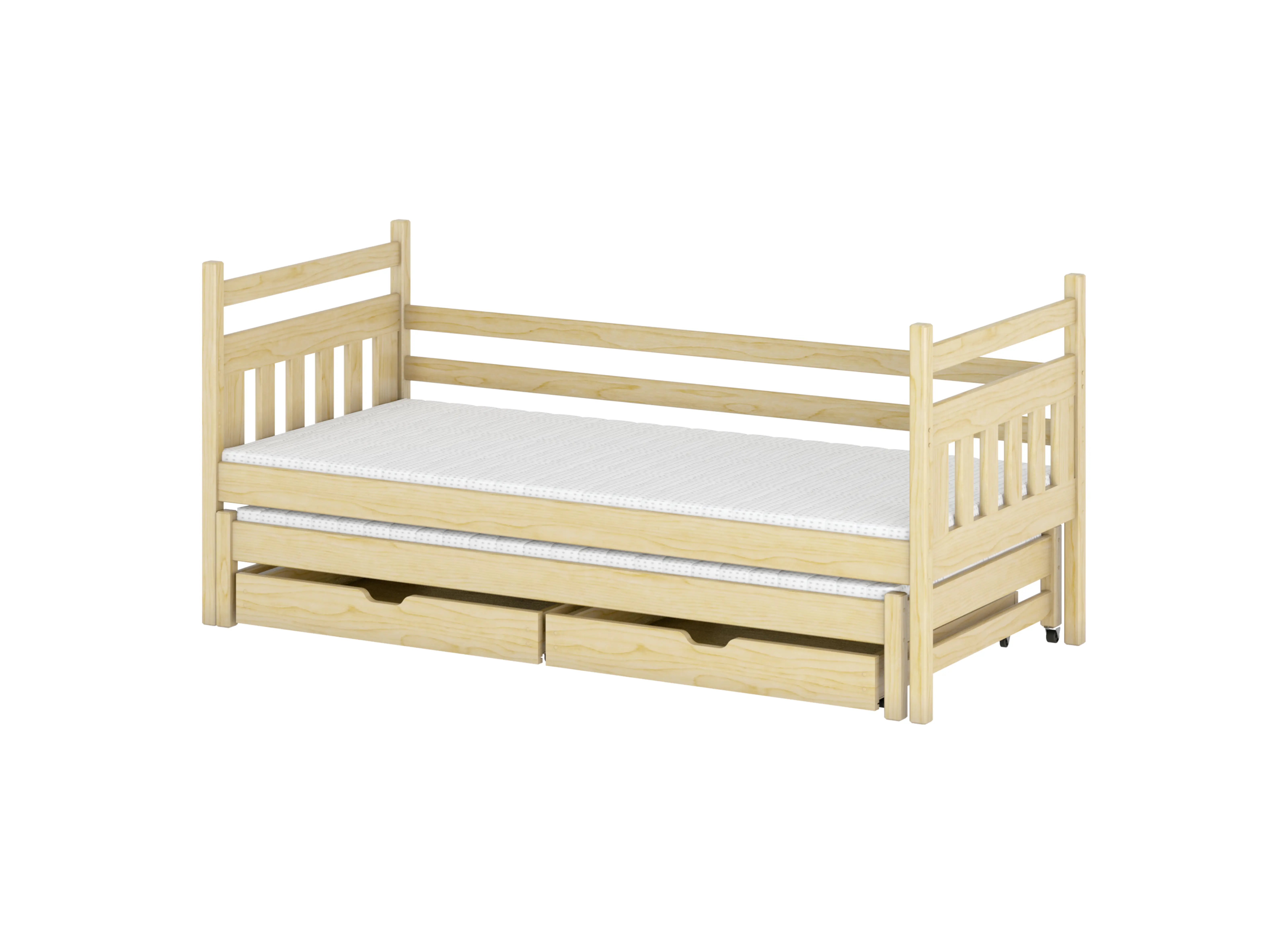Patrová postel DANIEL je ideální volbou pro dítě. Tento model dodává jedinečnou atmosféru, je skvěle zpracovaný a funkční – dbali jsme na každý detail. V naší dvojlůžkové posteli DANIEL se druhá matrace jednoduše vysouvá. Dětský pokoj s takovým nábytkem hodně získá. DANIEL je také postel se zásuvkami – použili jsme zde i dřevěné, pevné zábrany. Tato volba vypadá originálně a rozhodně se hodí jak do chlapecké, tak do dívčí ložnice. Mnoho prvků lze dodatečně konfigurovat. Rozhodně stojí za zmínku, že jsme dětskou postel DANIEL vyrobili z pevného borovicového dřeva. Má zábrany zajišťující bezpečnost dítěte. Navíc je to postel se zásuvkami, kde lze ukládat například hračky nebo jednoduše polštáře, ložní prádlo a přikrývky. Použili jsme zde rošt z březových lamel typu FLEX, což zaručuje nejvyšší komfort pro vaše dítě.