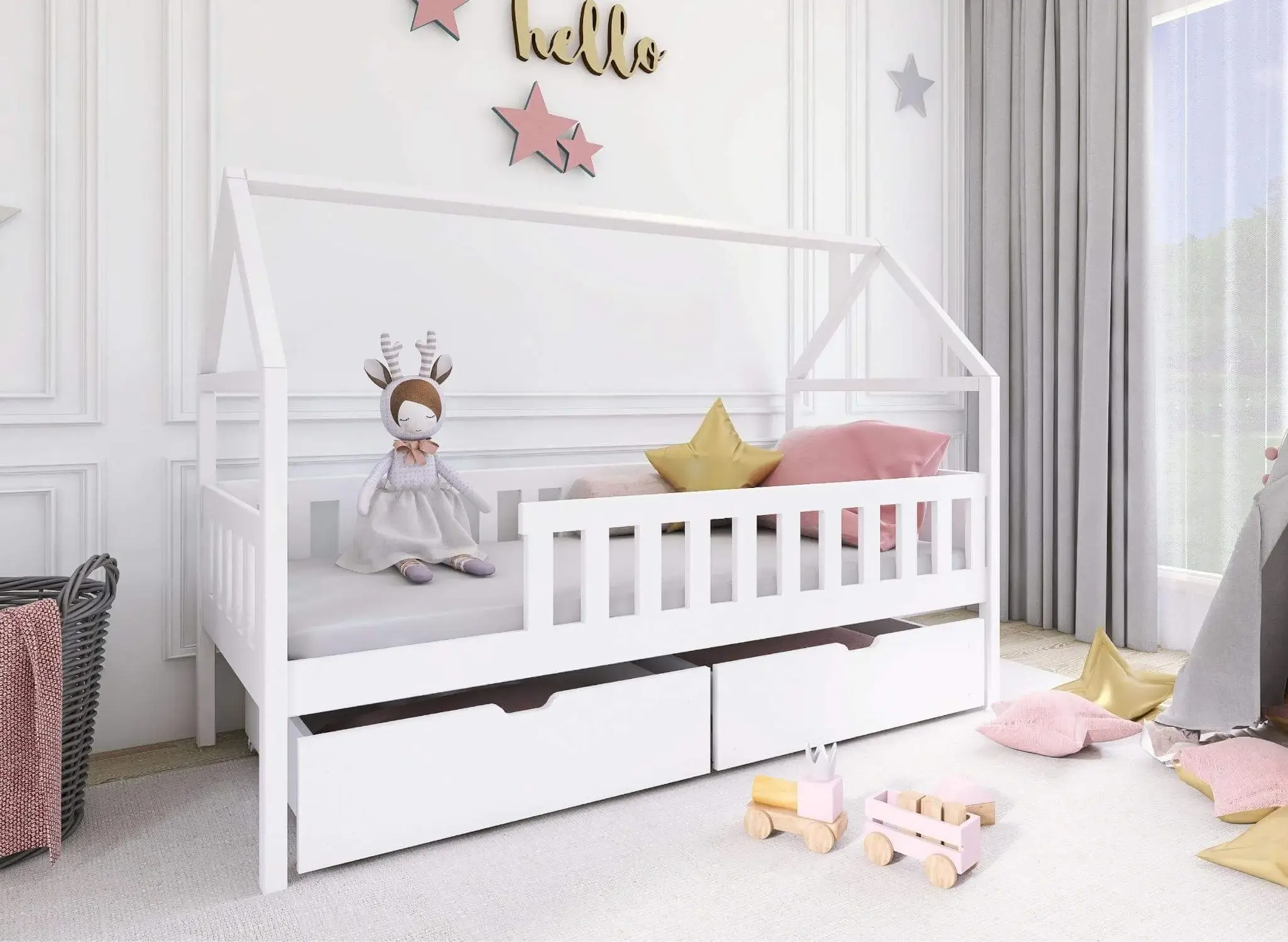 Všechny naše produkty splňují nejvyšší bezpečnostní standardy určené pro dětský nábytek. K výrobě tohoto modelu jsme použili borovicové dřevo, které je nejen trvanlivé, ale také pochází z odpovědného lesního hospodářství. Tím pádem má postel-domek DOMI ekologický charakter. Můžeme ji natřít jakoukoliv barvou, kterou si vaše dítě přeje, a to pomocí netoxických laků. V dětském pokoji vždy chybí úložný prostor – ať už na hračky, zimní oblečení nebo náhradní ložní prádlo. Tento model dětského nábytku je vybaven dvěma výsuvnými zásuvkami o velké kapacitě, které se určitě budou hodit.