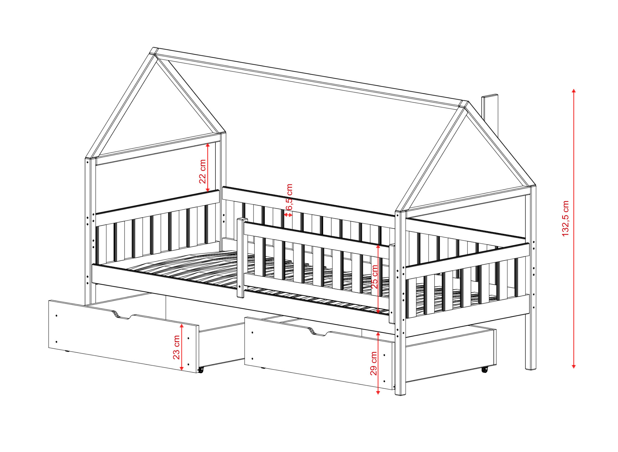 Všechny naše produkty splňují nejvyšší bezpečnostní standardy určené pro dětský nábytek. K výrobě tohoto modelu jsme použili borovicové dřevo, které je nejen trvanlivé, ale také pochází z odpovědného lesního hospodářství. Tím pádem má postel-domek DOMI ekologický charakter. Můžeme ji natřít jakoukoliv barvou, kterou si vaše dítě přeje, a to pomocí netoxických laků. V dětském pokoji vždy chybí úložný prostor – ať už na hračky, zimní oblečení nebo náhradní ložní prádlo. Tento model dětského nábytku je vybaven dvěma výsuvnými zásuvkami o velké kapacitě, které se určitě budou hodit.