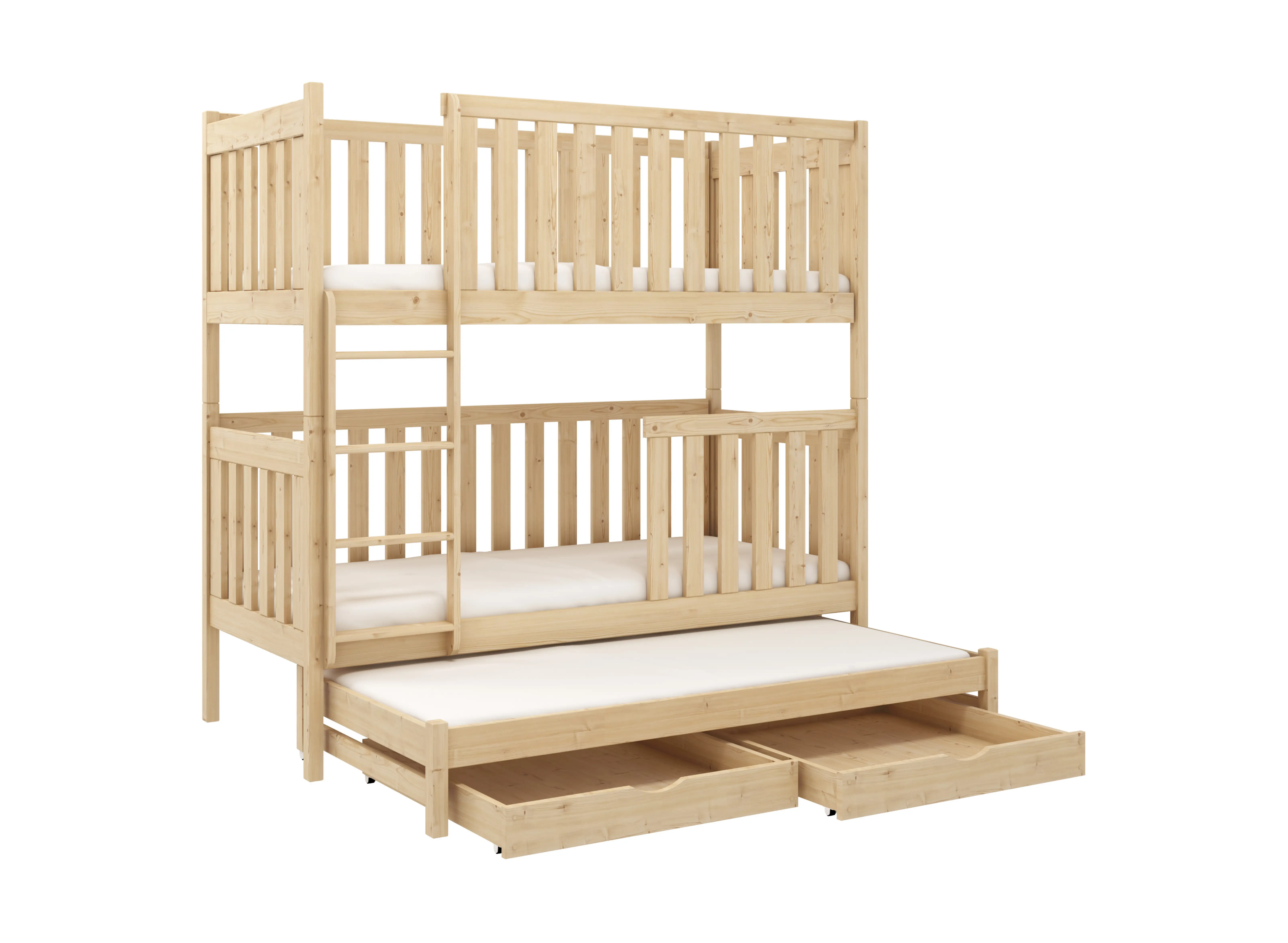 Patrová postel EMILKA je postel s obrovským potenciálem, velmi promyšlenou konstrukcí a je určená pro sourozence, kteří sdílejí jeden pokoj. Patrová postel EMILKA se skládá ze dvou úrovní a navíc výsuvné platformy s matrací. Přes den je skrytá a nezabírá místo v pokoji, v noci je vysunutá a umožňuje spánek třetího dítěte. Ušetříte tak spoustu volného prostoru v dětském pokoji. Dřevo je stále považováno za nejvíce trvanlivý a stabilní materiál. Vyznačuje se velkou odolností proti mechanickému poškození. Patrová postel EMILKA je vyrobena z borovicového dřeva, díky čemuž může být používána po mnoho let. Navíc je její povrch chráněn certifikovanými laky bezpečnými pro děti. Patrová postel EMILKA vypadá krásně po dlouhou dobu.