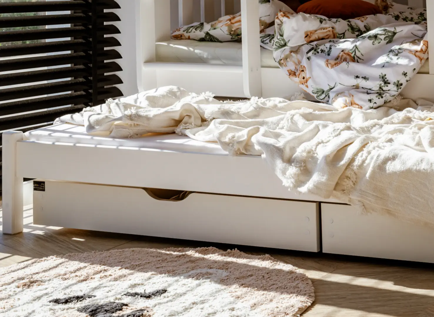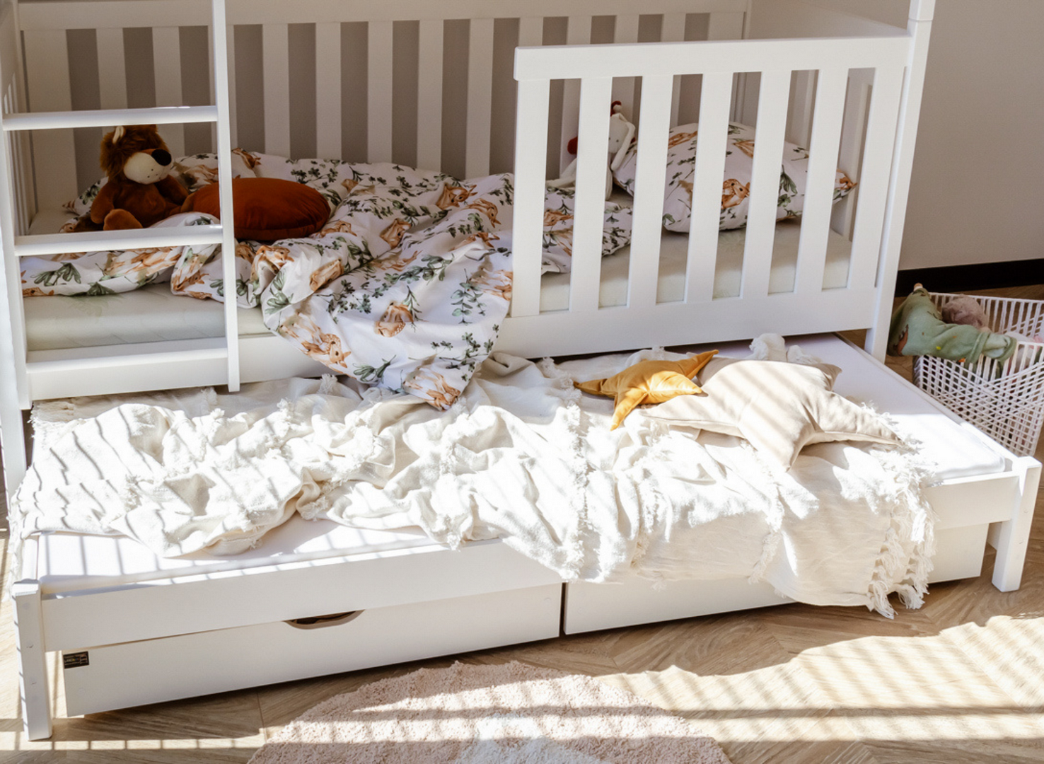 V malém pokoji, zejména pro sourozence, vždy chybí skříňky a police. Patrová postel EMILKA od Lano Meble je vybavena prostornými zásuvkami, které se nacházejí pod vysouvací platformou. Skvěle poslouží k uložení ložního prádla, ale také hraček nebo sezónního oblečení. To je příklad maximálně využitého potenciálu nábytku v dětském pokoji.