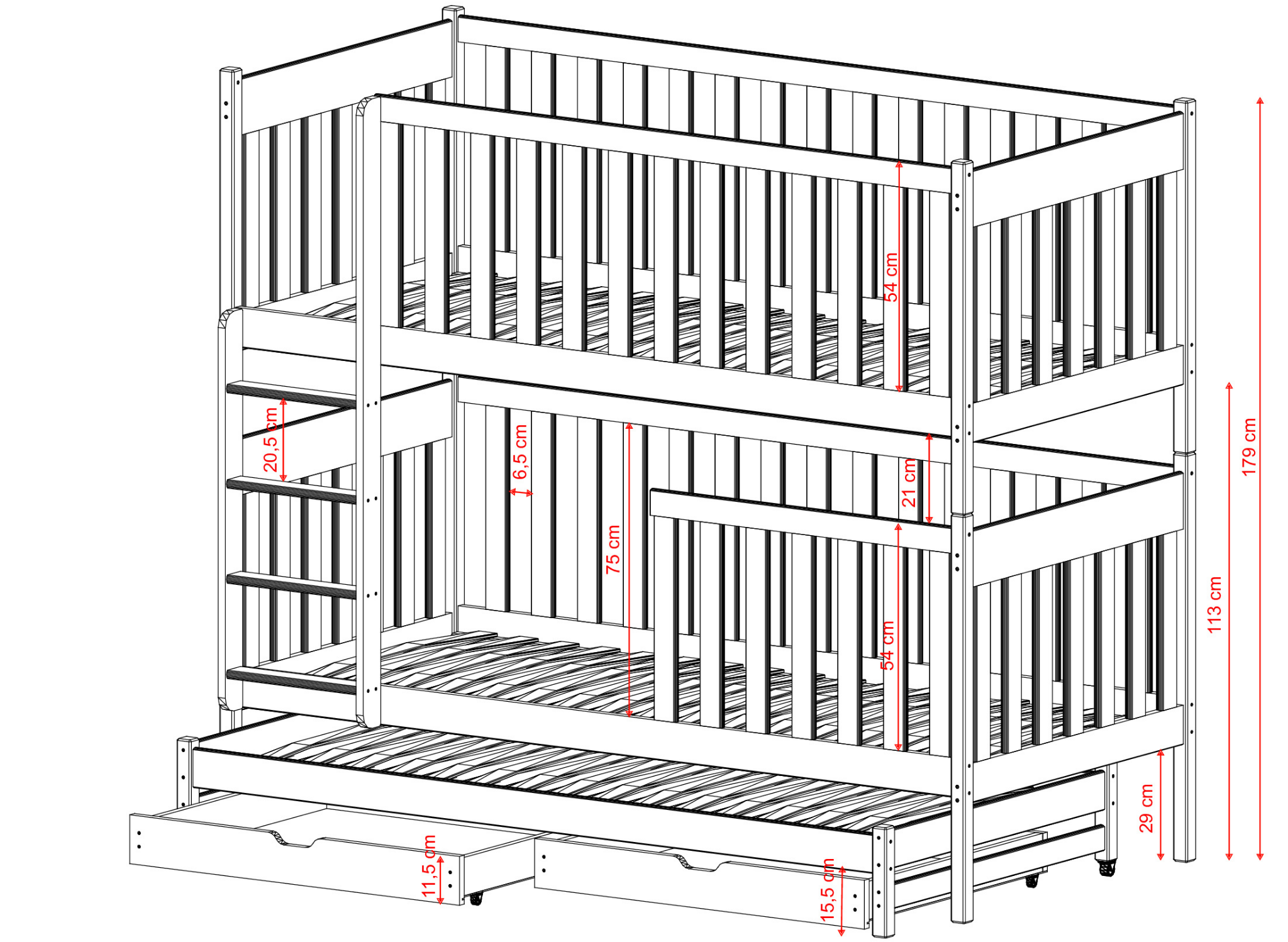 Patrová postel EMILKA je postel s obrovským potenciálem, velmi promyšlenou konstrukcí a je určená pro sourozence, kteří sdílejí jeden pokoj. Patrová postel EMILKA se skládá ze dvou úrovní a navíc výsuvné platformy s matrací. Přes den je skrytá a nezabírá místo v pokoji, v noci je vysunutá a umožňuje spánek třetího dítěte. Ušetříte tak spoustu volného prostoru v dětském pokoji. Dřevo je stále považováno za nejvíce trvanlivý a stabilní materiál. Vyznačuje se velkou odolností proti mechanickému poškození. Patrová postel EMILKA je vyrobena z borovicového dřeva, díky čemuž může být používána po mnoho let. Navíc je její povrch chráněn certifikovanými laky bezpečnými pro děti. Patrová postel EMILKA vypadá krásně po dlouhou dobu.
