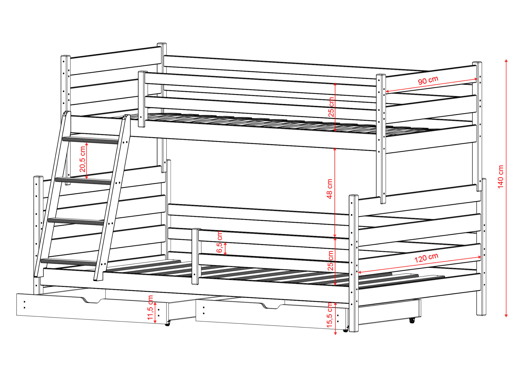 Zmiňovali jsme, že patrovou postel FAMI si vaše děti zamilují už od útlého věku? Teď vám řekneme něco, co způsobí, že si ji zamilujete i vy. Řeč je o žebříku, který je namontován pod sklonem. Díky tomuto řešení mohou vaše děti (i ty mladší) bezpečně a snadno vylézt a slézt z patrové postele FAMI, a vy můžete klidně spát. Dohodněme se, úložného prostoru nikdy není dost a my to dobře víme. Proto při navrhování nábytku v Lano Meble dbáme na to, aby naše postele byly nejen pohodlné, ale i praktické. Patrová postel FAMI je vybavena dvěma hlubokými zásuvkami, ve kterých mohou vaše děti uložit nejen další deku nebo polštář, ale také knihu nebo tablet.