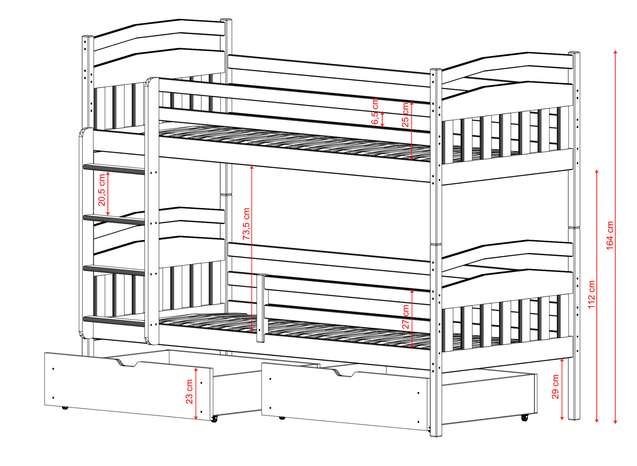 Dětská postel GABI je ideální volbou, když máte dvě děti. Postarali jsme se o jedinečný, magický design. Dětský pokoj získá zcela novou atmosféru. Patrová postel GABI je opravdu solidně zpracovaná. Použili jsme speciální zábrany pro bezpečnost dítěte a univerzální žebřík. K naší dětské posteli GABI si můžete samostatně vybrat matrace na spaní – stejně jako několik dalších parametrů a prvků postele. Patrová postel GABI je návrh, který splní i ty největší požadavky. Tato varianta se vyznačuje v mnoha ohledech. Patrovou postel GABI jsme vyrobili z pevného, kvalitního borovicového dřeva – což zajišťuje její odolnost. Dřevěné zábrany a univerzální žebřík patří k dalším důležitým výhodám. GABI je postel se zásuvkami, kde můžete uložit například hračky, polštáře, přikrývky nebo ložní prádlo. Stojí také za povšimnutí, že nabízíme možnost personalizace. Patrová postel GABI může být přizpůsobena podle vašich preferencí.