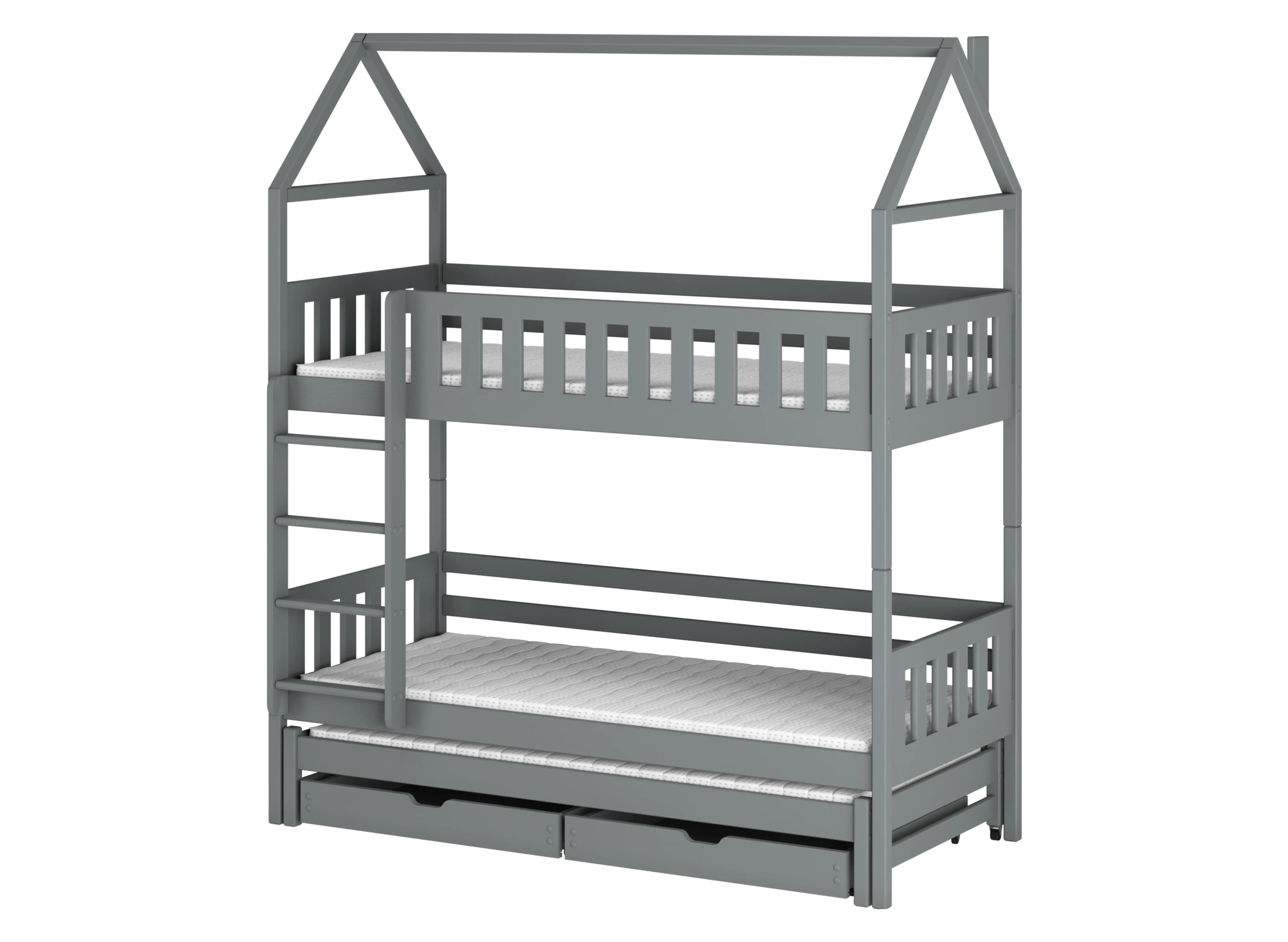 Patrovou postel domeček IGA jsme vybavili dvěma prostornými šuplíky pro ukládání ložního prádla, oblečení, hraček nebo jiných dětských věcí. Díky tomuto řešení ušetříte spoustu místa a zajistíte, že dětský pokoj bude úhledný a dobře organizovaný. Pamatujte, že při výběru patrové postele domeček IGA budou kontejnery vyrobeny v kombinaci s dřevotřískou.