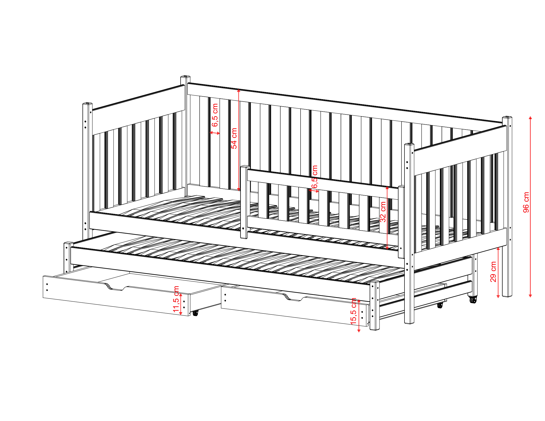 Aby byla nízká patrová postel KAJA ještě více funkční, zvolte výsuvné zásuvky. To poskytne další úložný prostor pro oblečení, hračky a ložní prádlo. Zásuvky jsou prostorné a pracují nezávisle na sobě, takže každý ze sourozenců může mít svou vlastní. Nízká patrová postel KAJA je vyrobena z přírodního borovicového dřeva. Tento materiál je velmi pevný a má vysokou mechanickou odolnost. Konstrukce rozkládací postele KAJA je odolná, velmi dobře snáší malé i velké zatížení, takže ji vaše děti budou užívat po mnoho let.