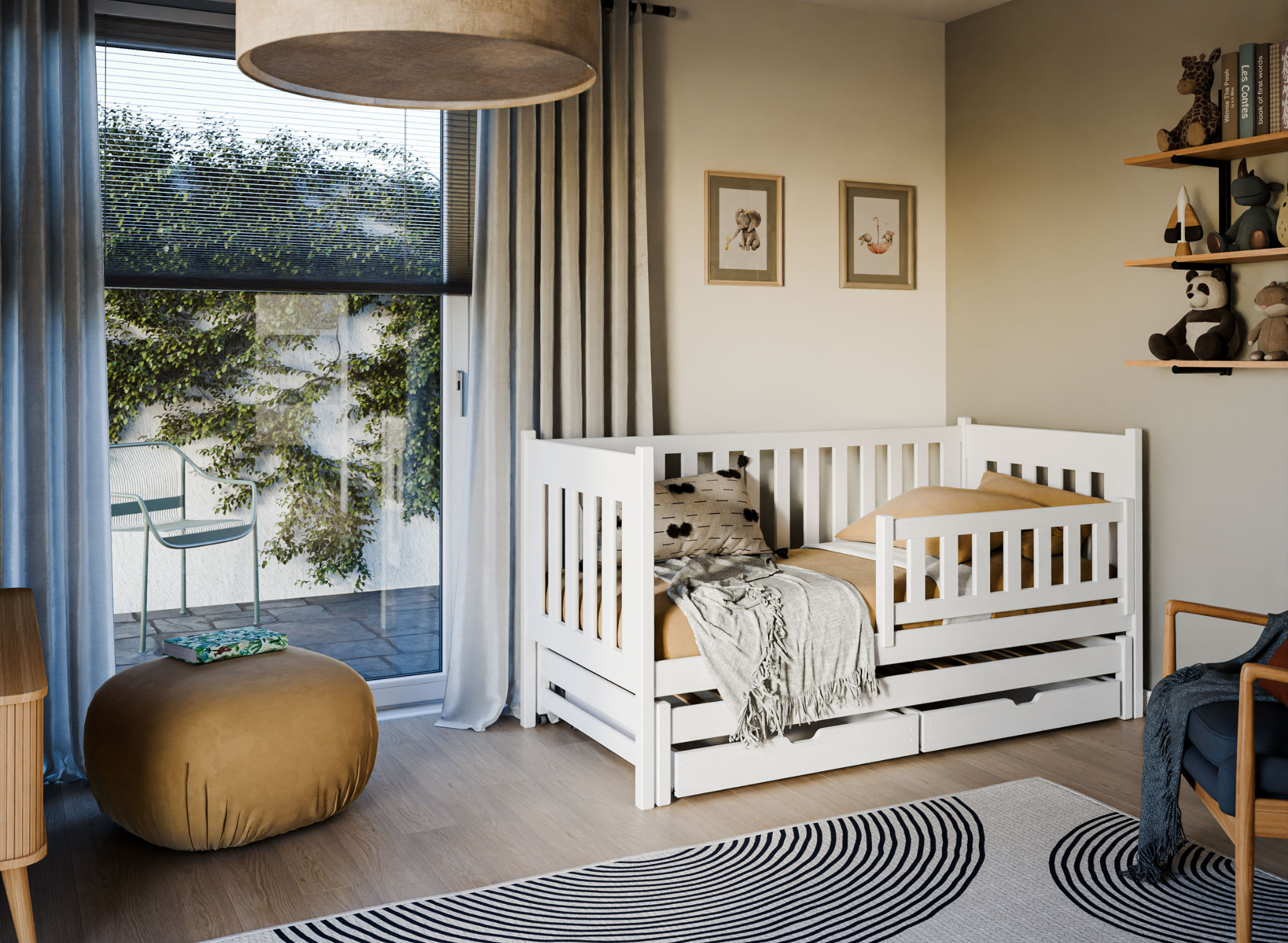 Aby byla nízká patrová postel KAJA ještě více funkční, zvolte výsuvné zásuvky. To poskytne další úložný prostor pro oblečení, hračky a ložní prádlo. Zásuvky jsou prostorné a pracují nezávisle na sobě, takže každý ze sourozenců může mít svou vlastní. Nízká patrová postel KAJA je vyrobena z přírodního borovicového dřeva. Tento materiál je velmi pevný a má vysokou mechanickou odolnost. Konstrukce rozkládací postele KAJA je odolná, velmi dobře snáší malé i velké zatížení, takže ji vaše děti budou užívat po mnoho let.