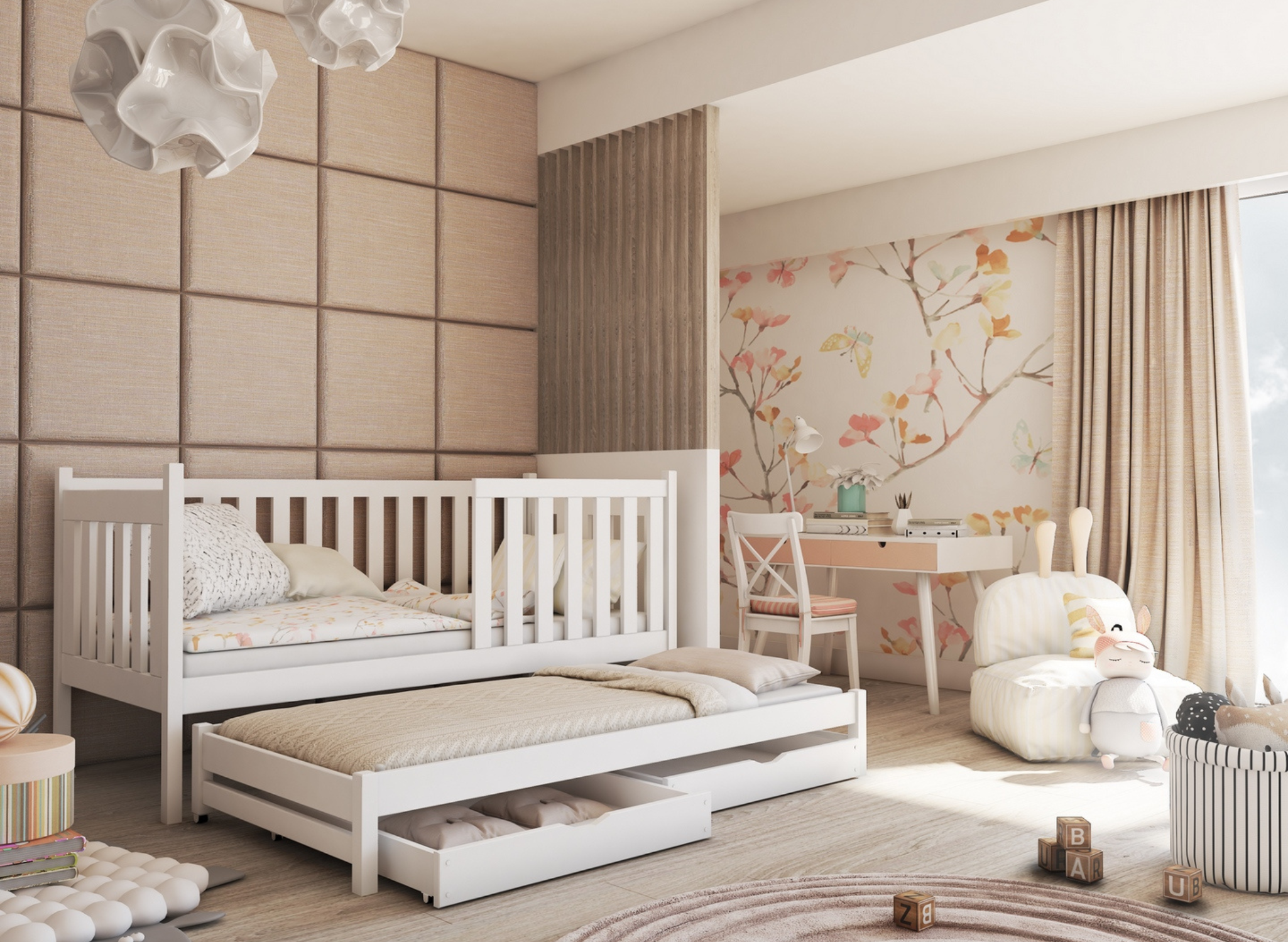 Bílá postel pro sourozence KAJA se zásuvkami je šancí na větší pořádek