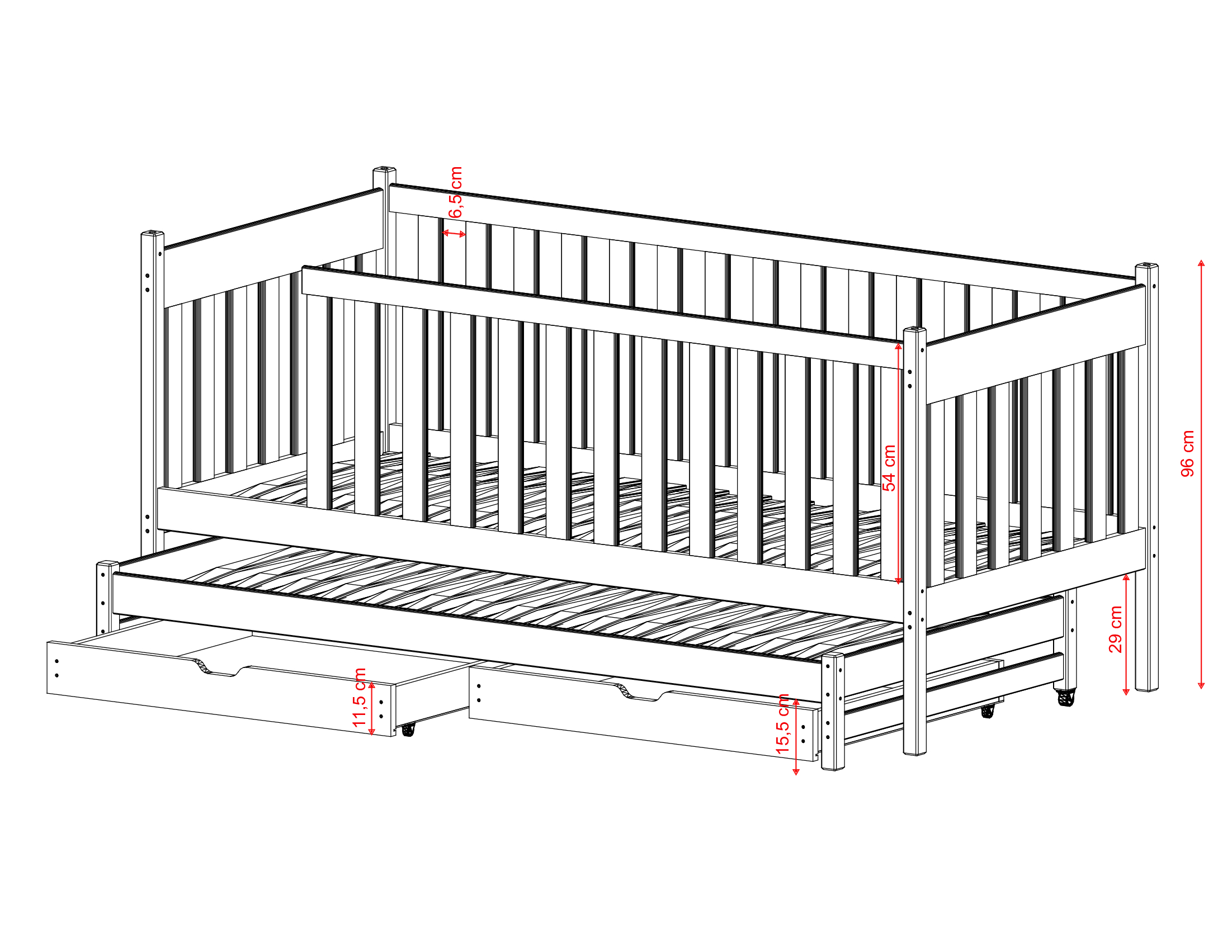 Aby byla nízká patrová postel KAJA ještě více funkční, zvolte výsuvné zásuvky. To poskytne další úložný prostor pro oblečení, hračky a ložní prádlo. Zásuvky jsou prostorné a pracují nezávisle na sobě, takže každý ze sourozenců může mít svou vlastní. Nízká patrová postel KAJA je vyrobena z přírodního borovicového dřeva. Tento materiál je velmi pevný a má vysokou mechanickou odolnost. Konstrukce rozkládací postele KAJA je odolná, velmi dobře snáší malé i velké zatížení, takže ji vaše děti budou užívat po mnoho let.