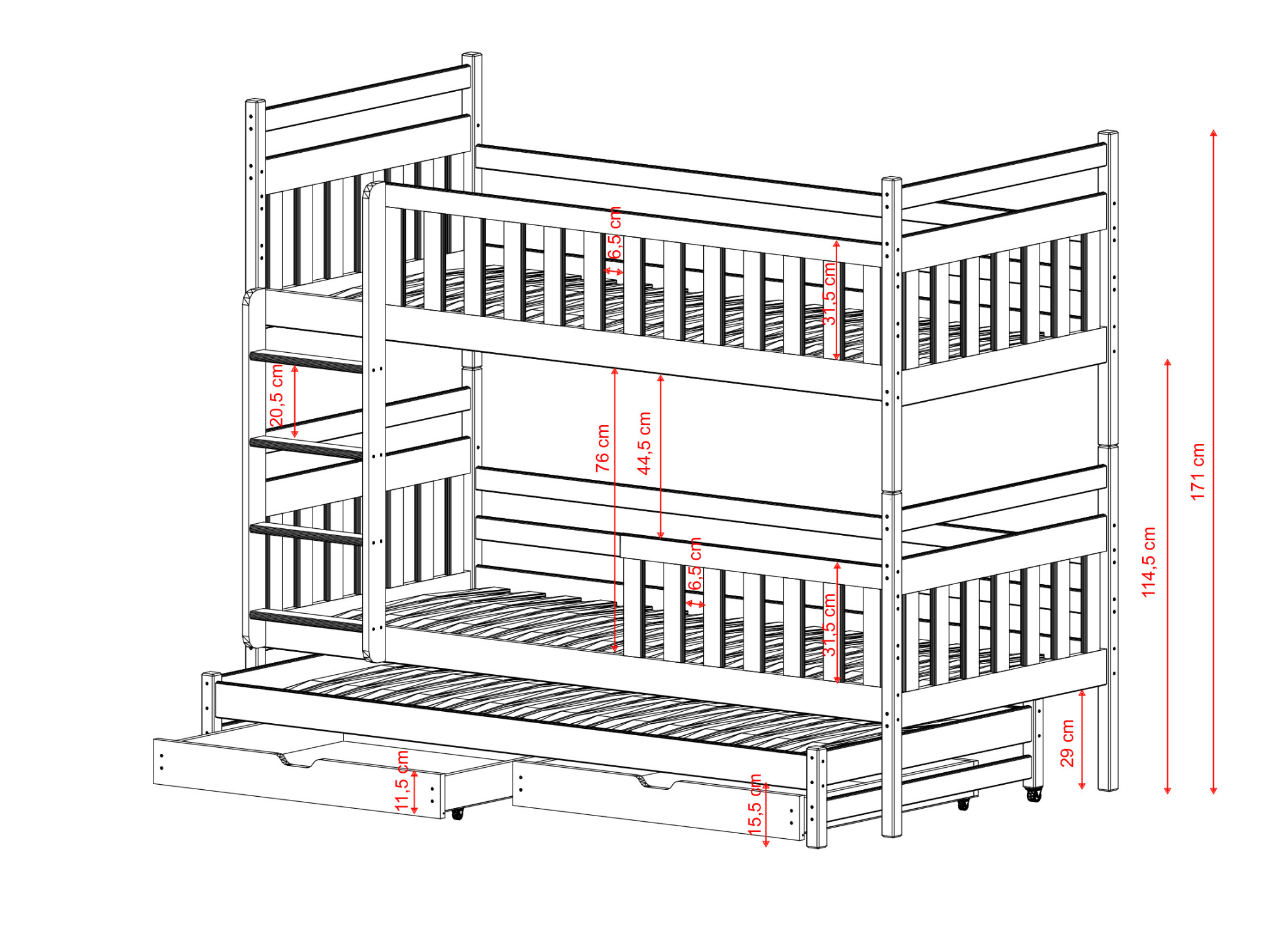 Patrová postel KLARA od Lano Meble je vyrobena s důrazem na každý, i ten nejmenší detail. Materiály, které používáme, se vyznačují nejvyšší kvalitou, protože chceme vašemu dítěti zajistit zdravý a klidný spánek. Patrová postel KLARA je zajímavou volbou do dětského pokoje zařízeného v klasickém stylu. Klasický rám patrové postele KLARA bude tvořit zajímavý akcent v království vašich dětí. Borovicové dřevo chráněné antialergenní barvou zajistí dlouhou životnost patrové postele KLARA po mnoho let. KLARA je třílůžková patrová postel, která splní potřeby i těch nejnáročnějších dětí. Ochranné zábrany jsou k dispozici ve dvou verzích – pevně namontované nebo odnímatelné. Ta druhá možnost vám umožní demontovat zábranu během dne, když si děti chtějí jen hrát. Na noc ji můžete nasadit, aby vaše dítě bylo během spánku v bezpečí. Patrová postel KLARA také obsahuje místo pro pohodlnou matraci na výsuvném lůžku. To je zajímavá volba, pokud máte děti podobného věku nebo často hostíte návštěvy.