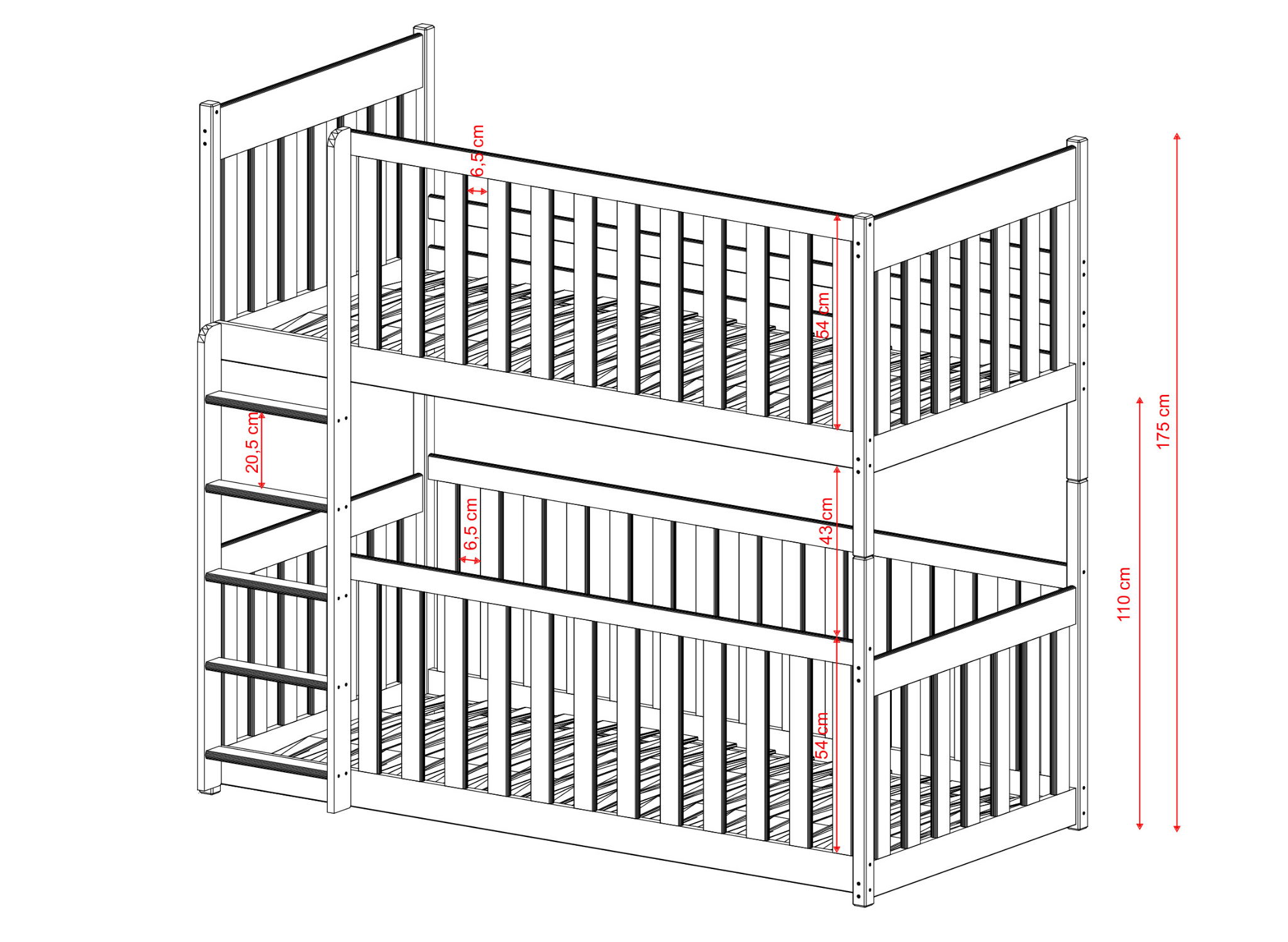 Patrová postel KONRAD je výjimečná a pomůže vám vytvořit jedinečnou atmosféru dětského pokoje. Vysoké zábradlí kromě bezpečnosti během spánku může být skvělým dekorativním prostorem. Dřevěné zábradlí postele KONRAD můžete ozdobit světýlky nebo papírovými výstřižky vašich ratolestí. V takto zařízeném dětském pokoji se vaše děti budou cítit svobodně, a to vše díky patrové dětské posteli KONRAD. Jedním z klíčových rysů patrové postele KONRAD jsou vysoké ochranné zábradlí. Na výběr máte několik druhů: plné zábradlí, odnímatelné, ¾ nebo ½. Bez ohledu na to, kterou z možností si vyberete, zajistí vašemu dítěti bezpečí během spánku. Pro starší děti se můžete rozhodnout i pro dětskou postel KONRAD bez zábradlí. Součástí sestavy je také pohodlný žebřík se širokými příčkami, který dětem usnadní lezení na vyšší patro. Během montáže patrové postele KONRAD můžete určit, na které straně bude vstup.
