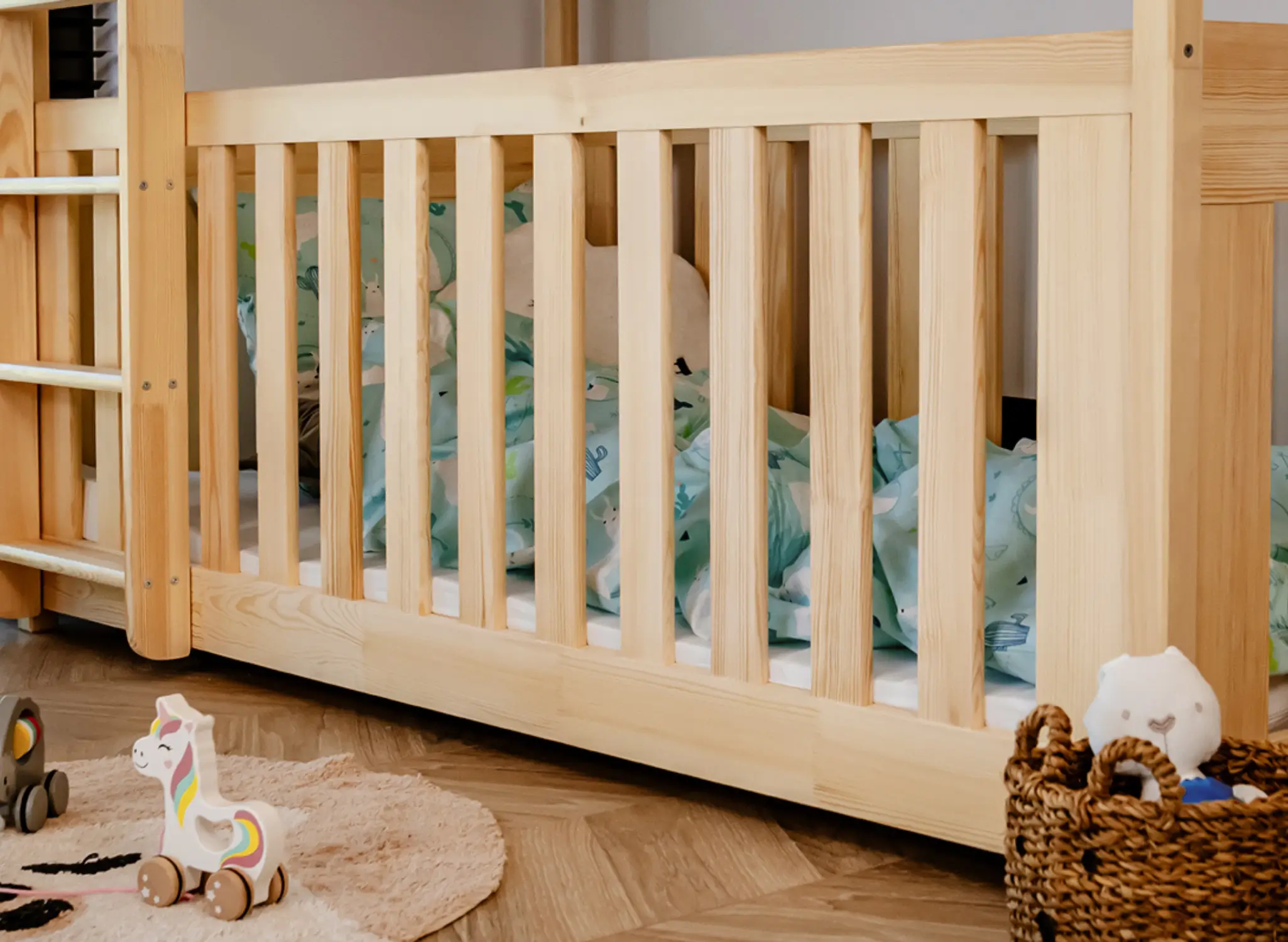 Patrová postel KONRAD je výjimečná a pomůže vám vytvořit jedinečnou atmosféru dětského pokoje. Vysoké zábradlí kromě bezpečnosti během spánku může být skvělým dekorativním prostorem. Dřevěné zábradlí postele KONRAD můžete ozdobit světýlky nebo papírovými výstřižky vašich ratolestí. V takto zařízeném dětském pokoji se vaše děti budou cítit svobodně, a to vše díky patrové dětské posteli KONRAD. Jedním z klíčových rysů patrové postele KONRAD jsou vysoké ochranné zábradlí. Na výběr máte několik druhů: plné zábradlí, odnímatelné, ¾ nebo ½. Bez ohledu na to, kterou z možností si vyberete, zajistí vašemu dítěti bezpečí během spánku. Pro starší děti se můžete rozhodnout i pro dětskou postel KONRAD bez zábradlí. Součástí sestavy je také pohodlný žebřík se širokými příčkami, který dětem usnadní lezení na vyšší patro. Během montáže patrové postele KONRAD můžete určit, na které straně bude vstup.