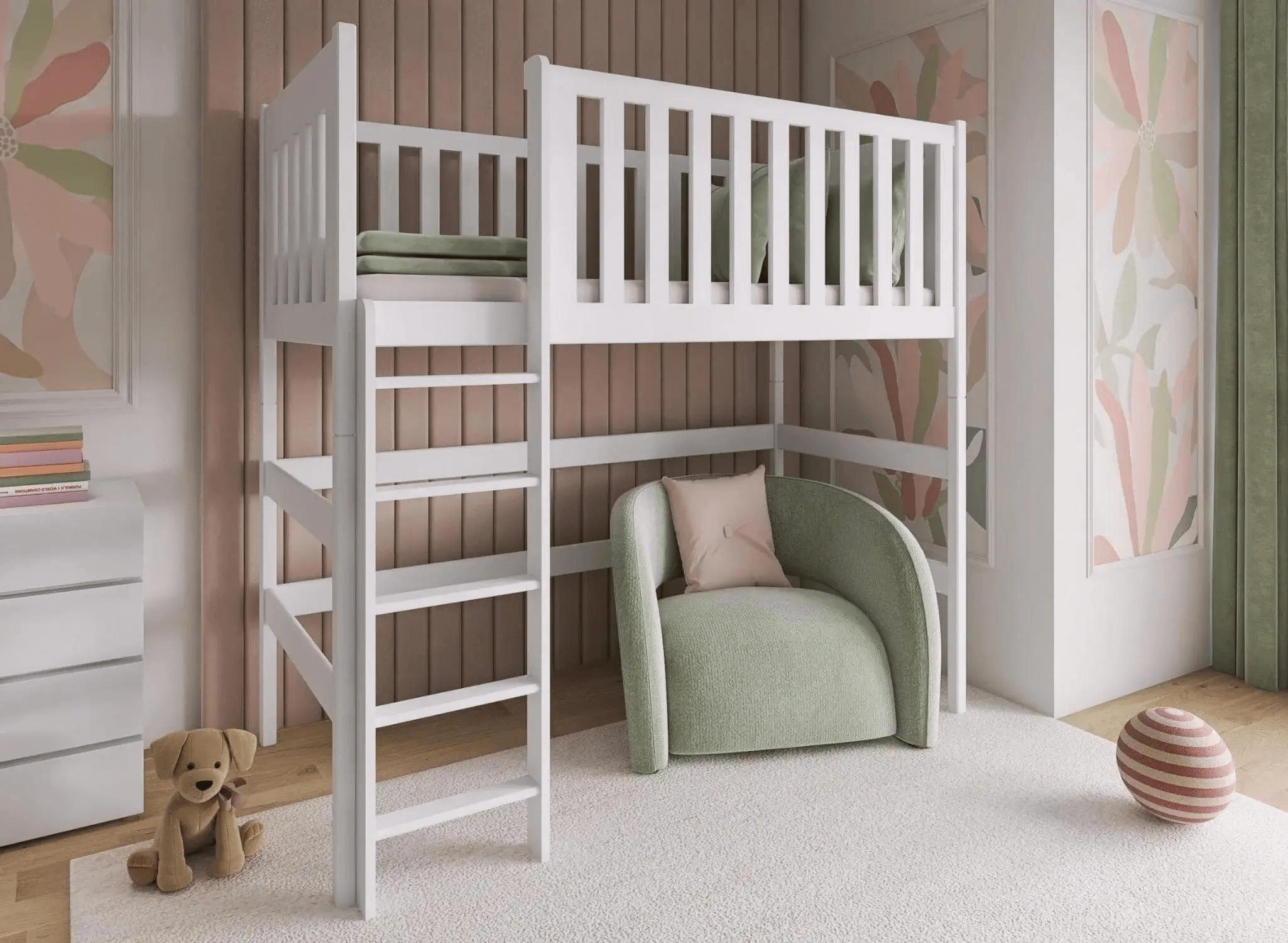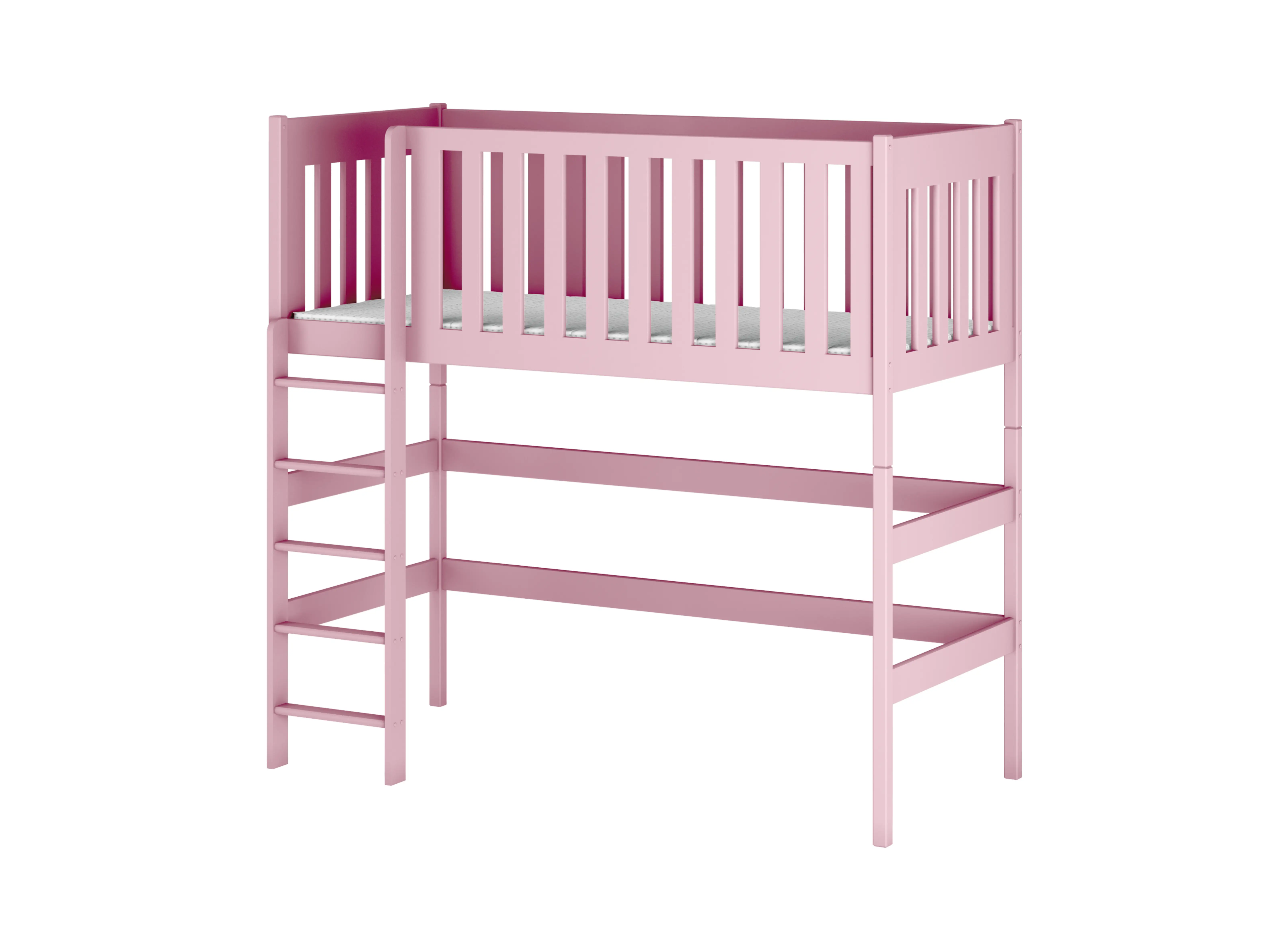 Růžová dětská postel LAURA 80x180 – jak vaše dítě preferuje spát? Jednolůžková palanda LAURA je jedinečným řešením, které zpestří výzdobu dětského pokoje. Design, který děti milují, však není jedinou výhodou tohoto kusu nábytku. Zjistěte více! Mezipatro je řešení šetřící místo, díky čemuž je ideální do malého dětského pokoje. Spodní část můžete uspořádat mimořádně praktickým způsobem – je to ideální místo pro uspořádání úložného koutku na hračky, umístění měkkých pufů pro relaxaci nebo vytvoření domácího úložného prostoru, který pomůže udržet pokoj uklizený. Okraj dětské postele je zakončen vysokým zábradlím, které zabraňuje pádům. Za bezpečný nastup je zodpovědný ergonomický žebřík s pohodlnými a stabilními schůdky.