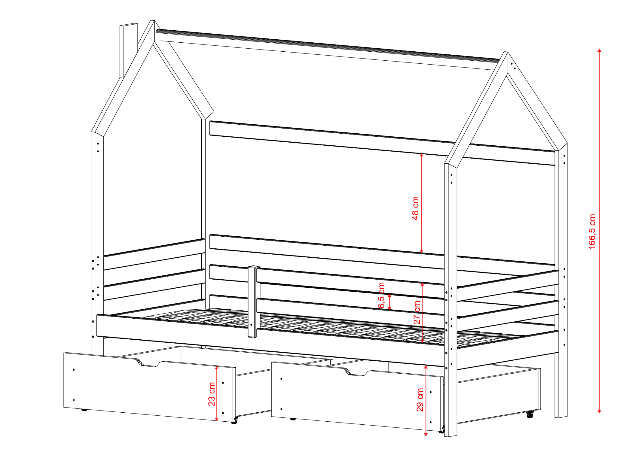 V Lano Meble dbáme o bezpečnost a zdraví vašeho dítěte, proto jsou naše dětské postele vyráběny z přírodního borovicového dřeva a pokryty certifikovanými barvami. Víme, že klidný spánek je základem vývoje každého dítěte. V našich nábytcích najdete pouze materiály nejvyšší kvality. Podívejte se, co nabízí dětská postel domek LILA a jaké jsou její největší přednosti. Rám dětské postele LILA typu domek je zcela vyroben z borovicového dřeva. Nahoře je dřevěný rám, který svým tvarem připomíná střechu, a dole březová lišta, která tvoří rám pod matraci. K dispozici máte také dvě prostorné zásuvky, které slouží jako praktický úložný prostor na lůžkoviny a hračky. Díky naší dětské posteli LILA typu domek získáte další prostor v dětském pokoji.