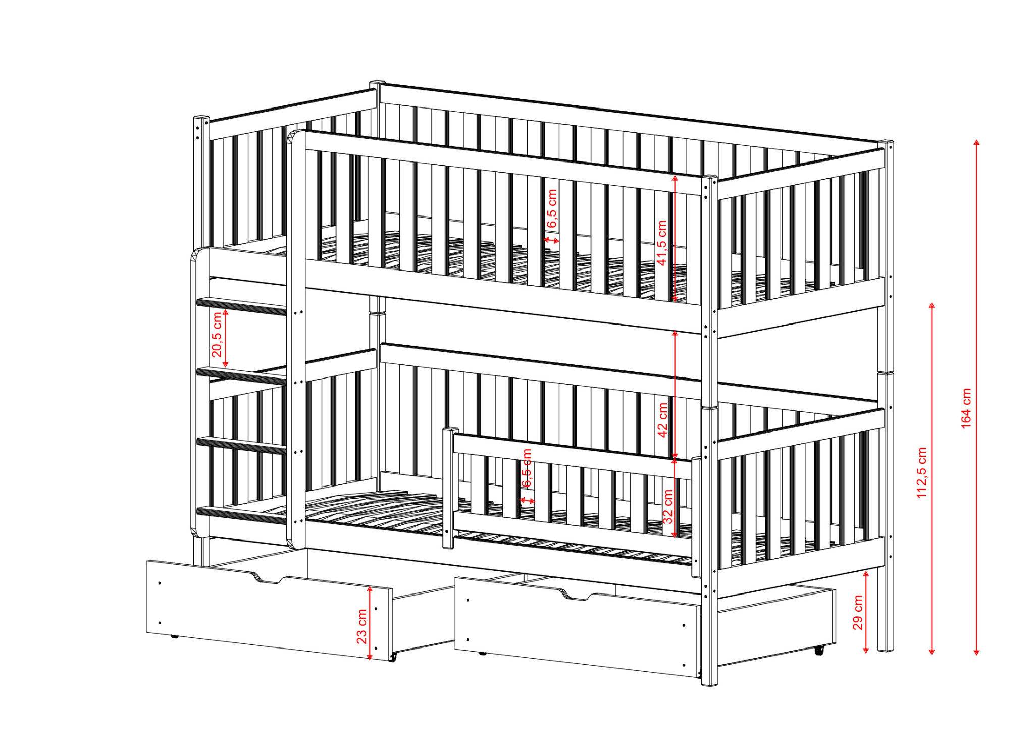 Všechna lůžka od Lano Meble jsou bez ostrých hran, aby vaše děti byly vždy v bezpečí během spánku. Patrová postel MICHALINA je také vybavena vysokými ochrannými zábradlími, takže ani těm nejaktivnějším dětem nehrozí pád. Široký a pohodlný žebřík usnadňuje lezení na horní patro. Rám postele je celý vyroben z borovicového dřeva, které se vyznačuje dobrou pružností a odolností a nevyžaduje náročnou údržbu. V Lano Meble dbáme na zdraví vašich dětí, proto bez ohledu na to, jakou barvu postele si vyberete, bude rám pokryt vodou ředitelnou, antialergickou barvou. Patrová postel MICHALINA se vyznačuje klasickým designem. Snadno ji sladíte s interiérem dětského pokoje. Pro mladší děti od 2 let je dobrou volbou pro zajištění vysoké úrovně bezpečnosti patrová postel MICHALINA s pevně zabudovaným zábradlím. Pro starší děti může být lepším řešením odnímatelné zábradlí.