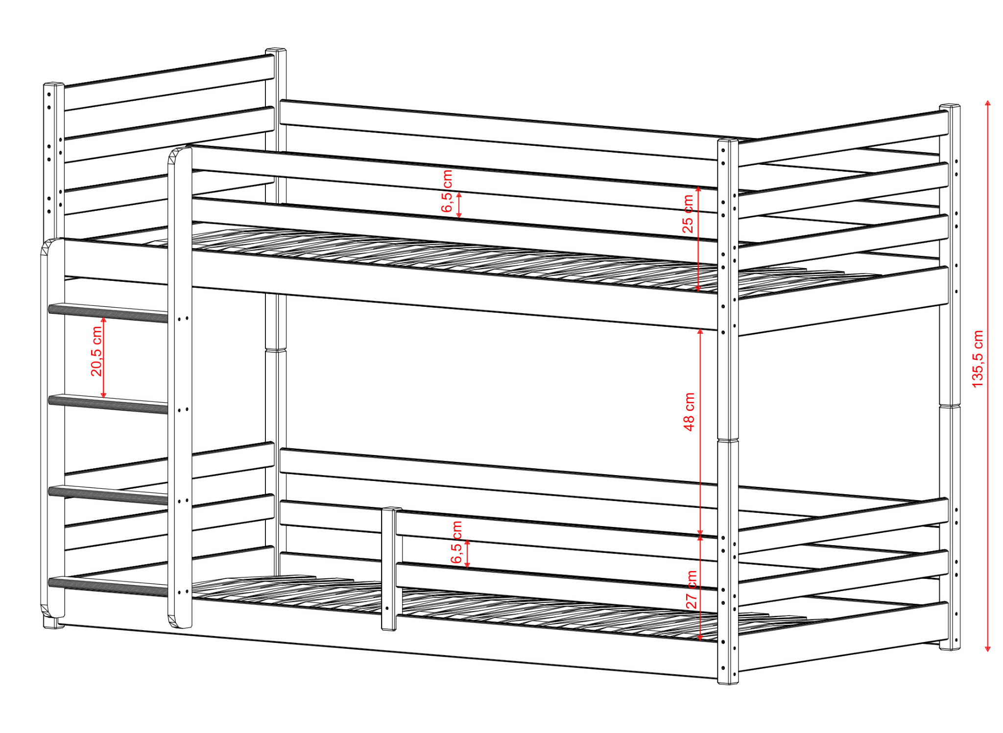 Patrová postel MINI je nábytek, který byl vyvinut na základě zkušeností a pozorování nejmenších. Díky tomu jsme dokázali vytvořit řešení, které je nesmírně pohodlné, bezpečné a zároveň svým stylem zapadne do mnoha aranžmá. Možnost montáže žebříku na obou stranách dělá z patrové postele MINI skvělou volbu bez ohledu na velikost a tvar dětského pokoje. Nečekejte a připojte se k řadě spokojených zákazníků Lano Meble. Dvě děti doma jsou jistě velkou radostí! Musíte však myslet na funkční řešení, která šetří prostor. Patrová postel MINI splňuje tato očekávání dokonale! Tento nábytek je splněním snu každého dítěte. Podívejte se, čím vás ještě překvapí. Konstrukce patrové postele MINI je vyrobena z borovicového dřeva, což je velmi pevný materiál. Toto řešení se jistě zalíbí každému dítěti bez ohledu na věk nebo pohlaví. Dokonalé proporce postele a pečlivé zpracování zaručují pohodlný, klidný a hluboký spánek pro dvě děti.