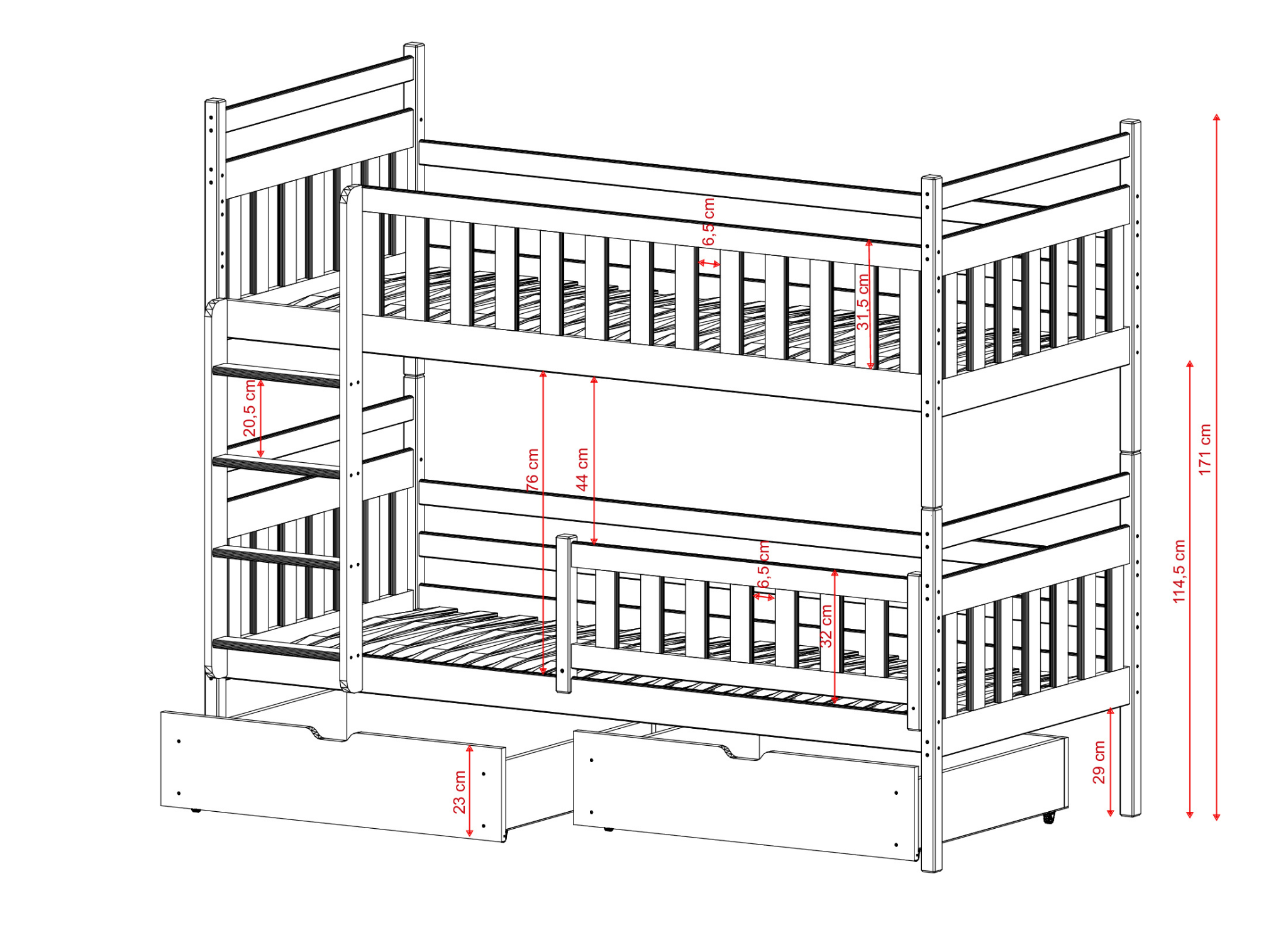 Patrová postel MONIKA je skvělé řešení nejen do malých prostor, ale také do každého dětského pokoje, kde bydlí sourozenci. Proč? Taková postel podněcuje představivost a podporuje kreativitu. Podívejte se také na praktickou stránku postele pro sourozence MONIKA. Obě části můžete rozložit a vytvořit tak dvě nezávislé spací zóny. Při objednání naší patrové postele MONIKA vám dáváme velkou volnost. Můžete si nábytek přizpůsobit tak, aby vyhovoval potřebám vašich dětí. Vy rozhodujete o tom, zda bude prostor pod postelí vybaven dvěma zásuvkami. Při objednávání také rozhodujete, zda mají být zábradlí na patrové posteli MONIKA pevně namontována nebo odnímatelná.