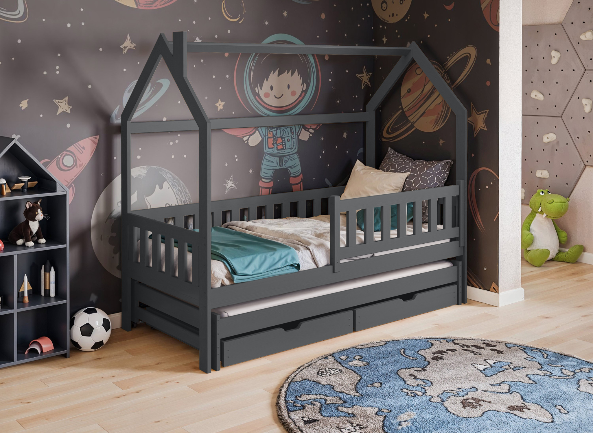 Grafitová dětská postel domek MONKEY se zásuvkami – extra úložný prostor