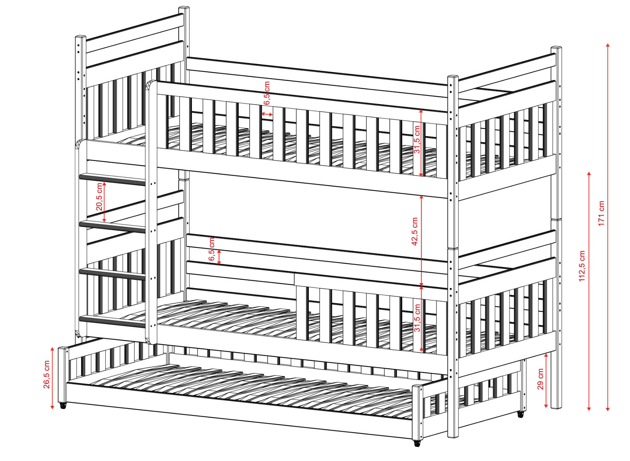 Naše patrová postel OLIWIA se skvěle hodí nejen do dětského pokoje, kde bydlí tři sourozenci, ale také do pokoje, kde bydlí dva bratři nebo sestry. A co třetí postel? Je to skvělé řešení, když vaše děti rády zvou kamarády na přespání, nebo když babička či dědeček přijdou na návštěvu ke svým vnoučatům a chtějí zůstat trochu déle.