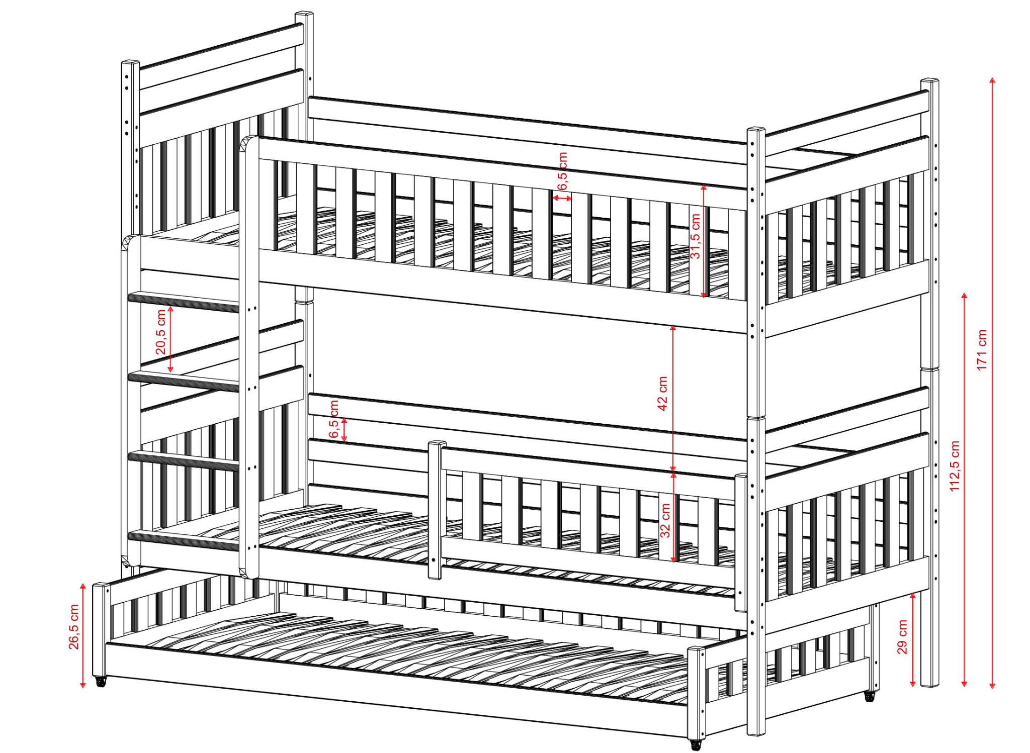 Naše patrová postel OLIWIA se skvěle hodí nejen do dětského pokoje, kde bydlí tři sourozenci, ale také do pokoje, kde bydlí dva bratři nebo sestry. A co třetí postel? Je to skvělé řešení, když vaše děti rády zvou kamarády na přespání, nebo když babička či dědeček přijdou na návštěvu ke svým vnoučatům a chtějí zůstat trochu déle.