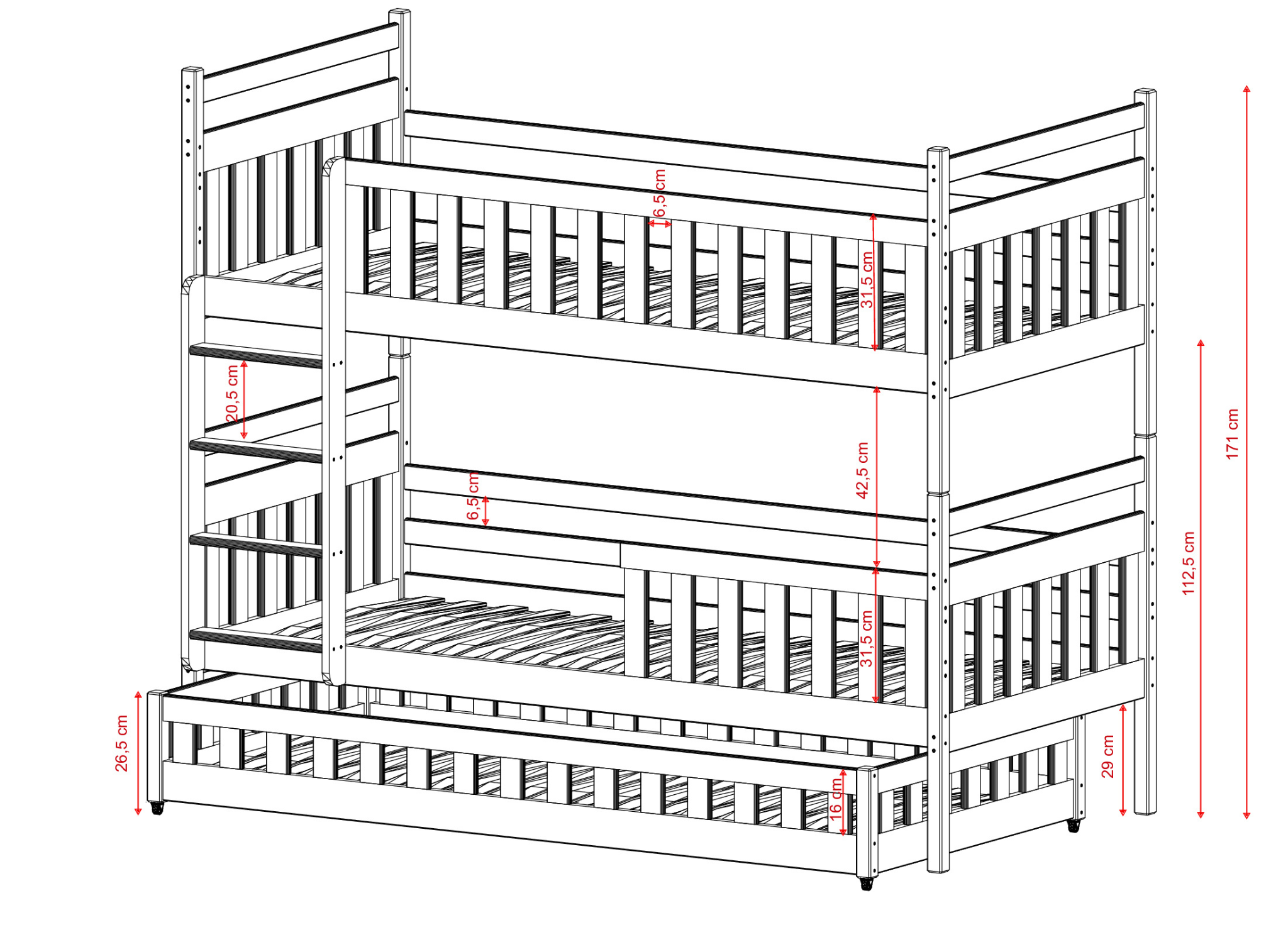 Naše patrová postel OLIWIA se skvěle hodí nejen do dětského pokoje, kde bydlí tři sourozenci, ale také do pokoje, kde bydlí dva bratři nebo sestry. A co třetí postel? Je to skvělé řešení, když vaše děti rády zvou kamarády na přespání, nebo když babička či dědeček přijdou na návštěvu ke svým vnoučatům a chtějí zůstat trochu déle.