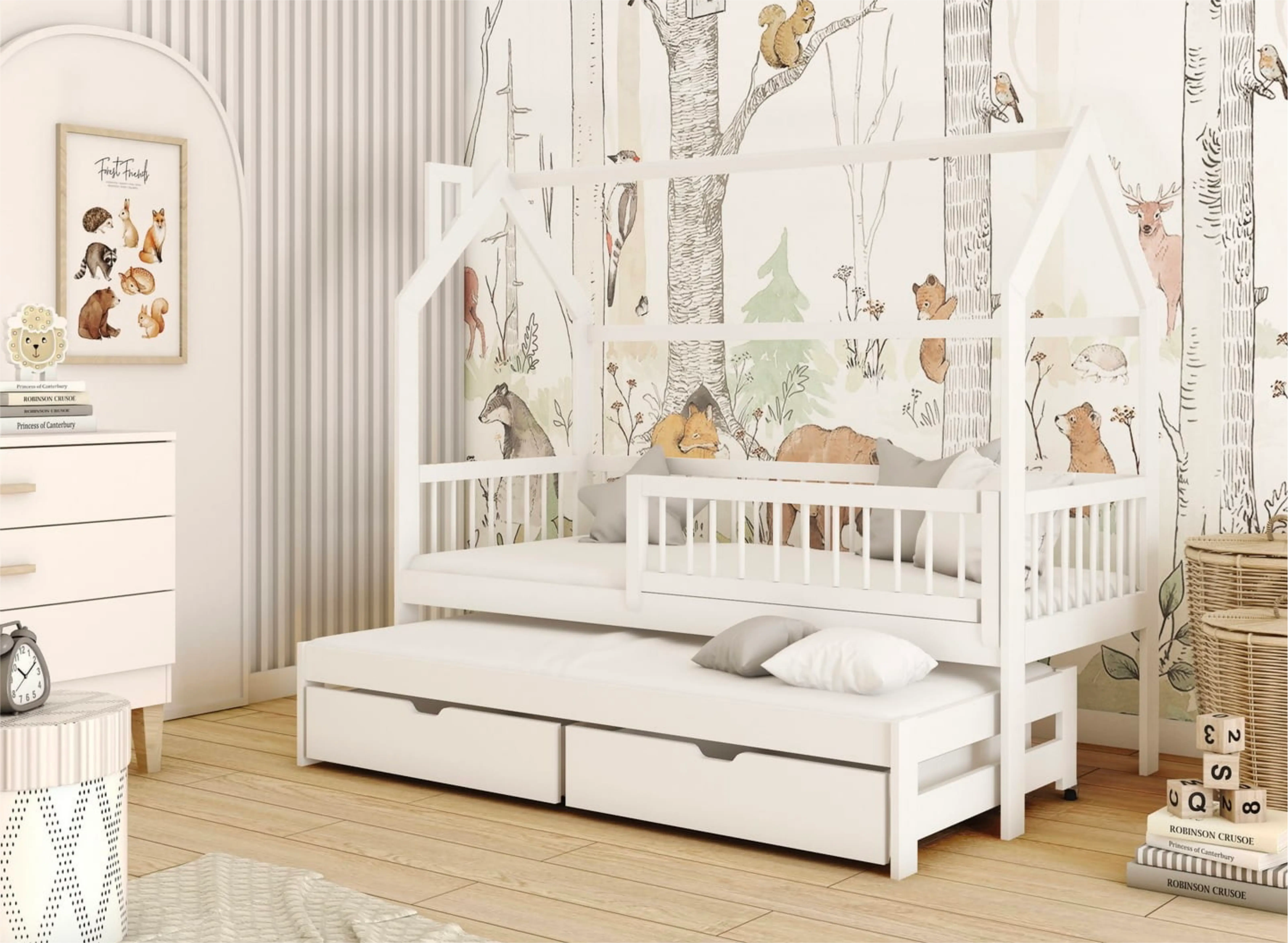 Kromě roztomilého designu má dětská postel domeček PAPI poměrně jednoduchou konstrukci, která se hodí do jakéhokoli stylu dětského pokoje. To je velká výhoda. I když plánujete rekonstrukci pokoje, můžete si být jisti, že tato postel se dokonale hodí do každé aranžace. Vyberte si dětskou postel domeček PAPI a uvidíte, že vaše dítě už nikdy nebude mít problémy s usínáním. S její pomocí vytvoříte pohádkovou a velmi útulnou scénu v dětském pokoji. Existuje mnoho důvodů, proč se rozhodnout pro dětskou postel domeček PAPI. Především je to značná funkčnost, kterou nabízí. Především postel má výsuvné lůžko, díky čemuž může rodič v případě potřeby být vedle dítěte. Je to také druhé, pohodlné místo na spaní pro sourozence. Takové kompaktní řešení šetří spoustu místa. To však není vše. Dětská postel domeček PAPI má také dvě velké a prostorné zásuvky, které jsou umístěny pod rámem. Díky nim můžete ukládat různé drobnosti, takže konečně zavládne pořádek.