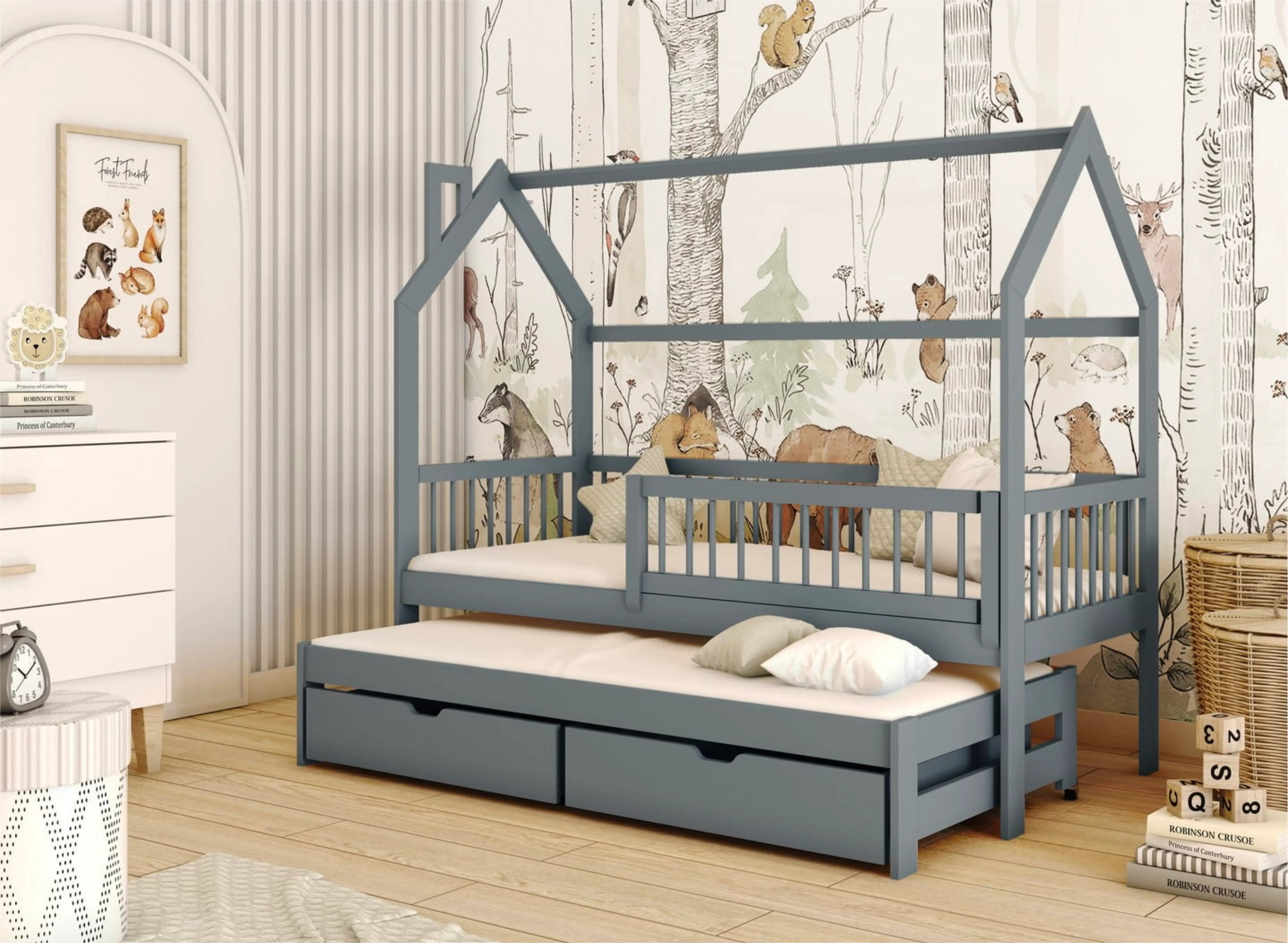 Kromě roztomilého designu má dětská postel domeček PAPI poměrně jednoduchou konstrukci, která se hodí do jakéhokoli stylu dětského pokoje. To je velká výhoda. I když plánujete rekonstrukci pokoje, můžete si být jisti, že tato postel se dokonale hodí do každé aranžace. Vyberte si dětskou postel domeček PAPI a uvidíte, že vaše dítě už nikdy nebude mít problémy s usínáním. S její pomocí vytvoříte pohádkovou a velmi útulnou scénu v dětském pokoji. Existuje mnoho důvodů, proč se rozhodnout pro dětskou postel domeček PAPI. Především je to značná funkčnost, kterou nabízí. Především postel má výsuvné lůžko, díky čemuž může rodič v případě potřeby být vedle dítěte. Je to také druhé, pohodlné místo na spaní pro sourozence. Takové kompaktní řešení šetří spoustu místa. To však není vše. Dětská postel domeček PAPI má také dvě velké a prostorné zásuvky, které jsou umístěny pod rámem. Díky nim můžete ukládat různé drobnosti, takže konečně zavládne pořádek.