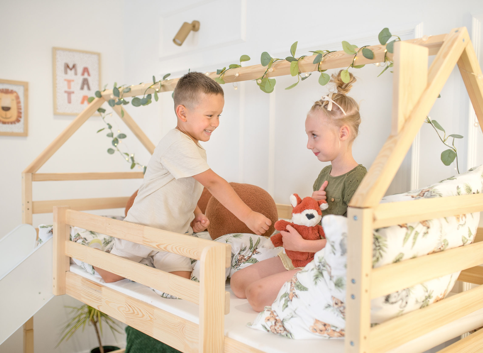 Patrová postel PLAY přitahuje pozornost a vytváří charakter pokoje díky svému jedinečnému vzhledu – je to postel ve tvaru domečku s přidanou skluzavkou. Zároveň poskytuje vynikající komfort a funkčnost. Je to skvělá volba pro sourozence, kteří si chtějí užít svůj vlastní pohádkový koutek v pokoji. Skvěle organizuje prostor a umožňuje navrhnout pokoj snů pro vaše děti. Čím se ještě vyznačuje patrová postel PLAY? Nabízíme vám na výběr šest krásných barev postele. Pokud však žádná z nich není pro vás ideální, můžete postel přizpůsobit výběrem barvy z široké palety odstínů. Pomůžeme vám také vybrat správnou velikost postele, aby rostla spolu s dítětem. Pokud to bude nutné, můžete patrovou postel PLAY rozdělit na dvě samostatná lůžka.