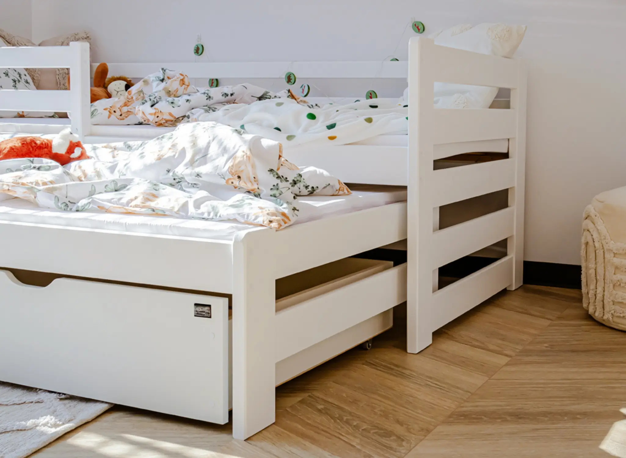 Konečný vzhled postele pro sourozence SENSO závisí na vás. Můžete rozhodnout o typu matrací podle individuálních potřeb a preferencí dětí. Každá ze dvou matrací může být jiná. Při objednávce si také vybíráte možnost se zásuvkami nebo bez.