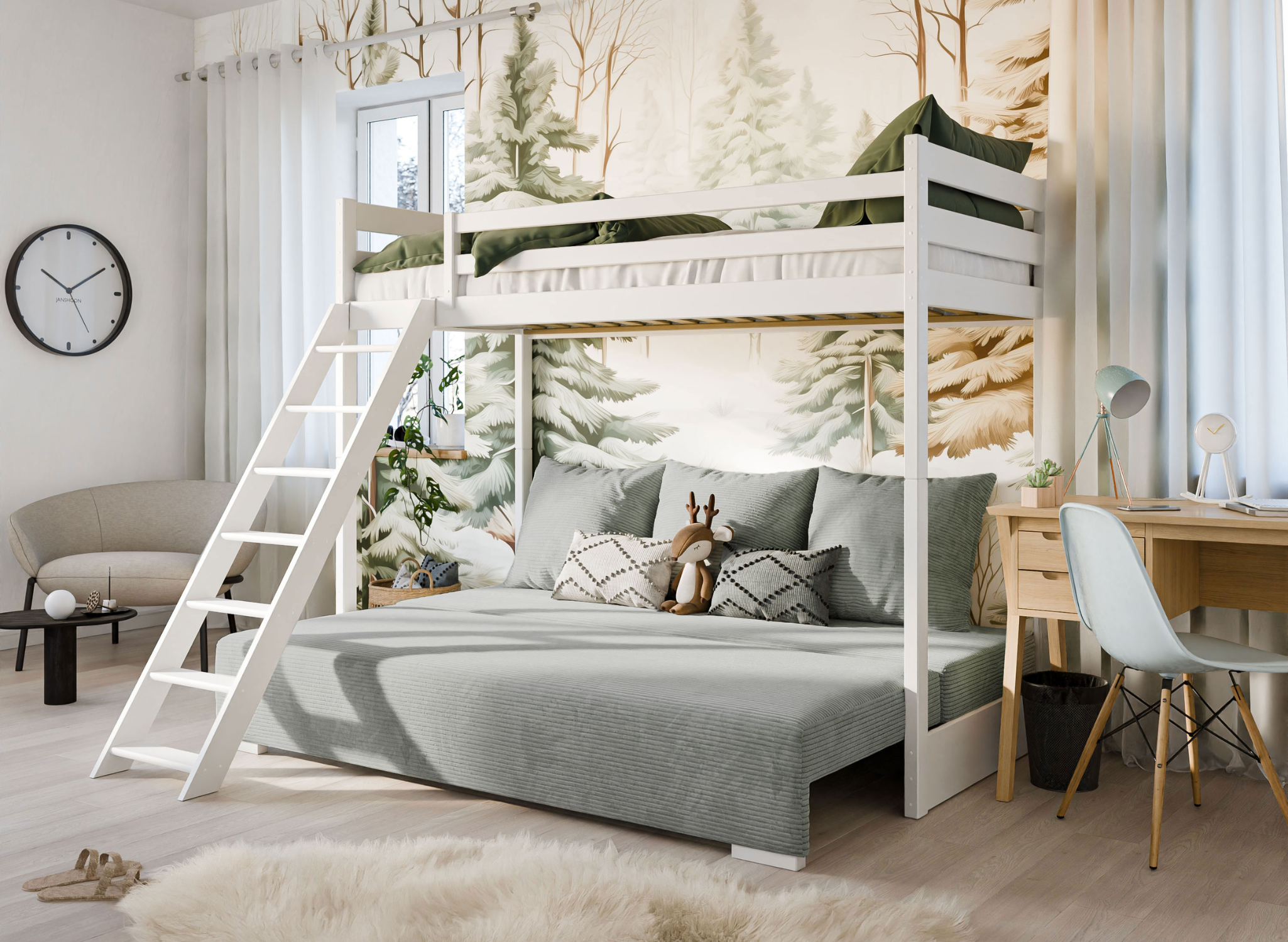 Patrová postel na podestě s pohovkou SOFINO 90x200/140x200 vás zaujme svou neotřelou kombinací